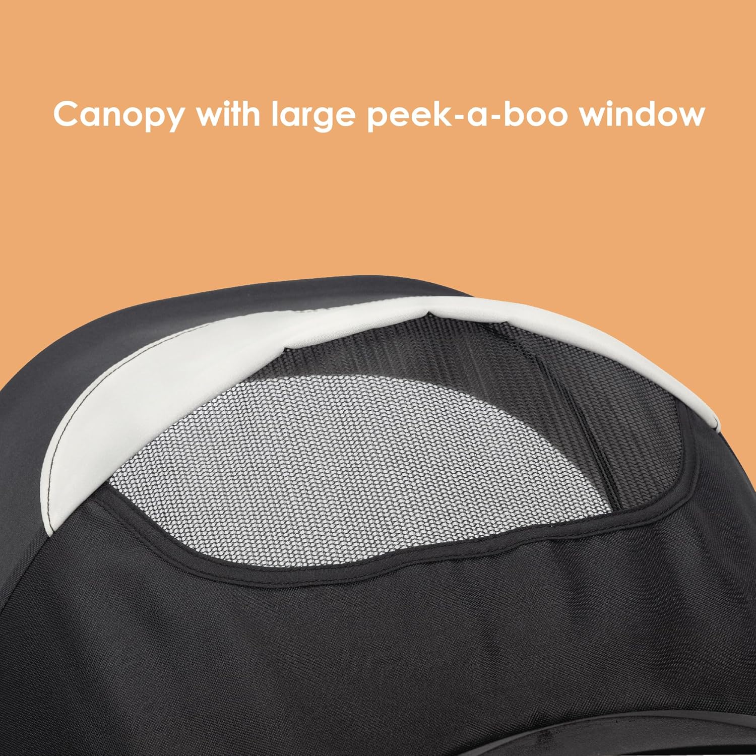 Comfort cabin with over-sized canopy with UPF 50+ protection, premium padding and dual suspension, and large storage basket with front and rear access