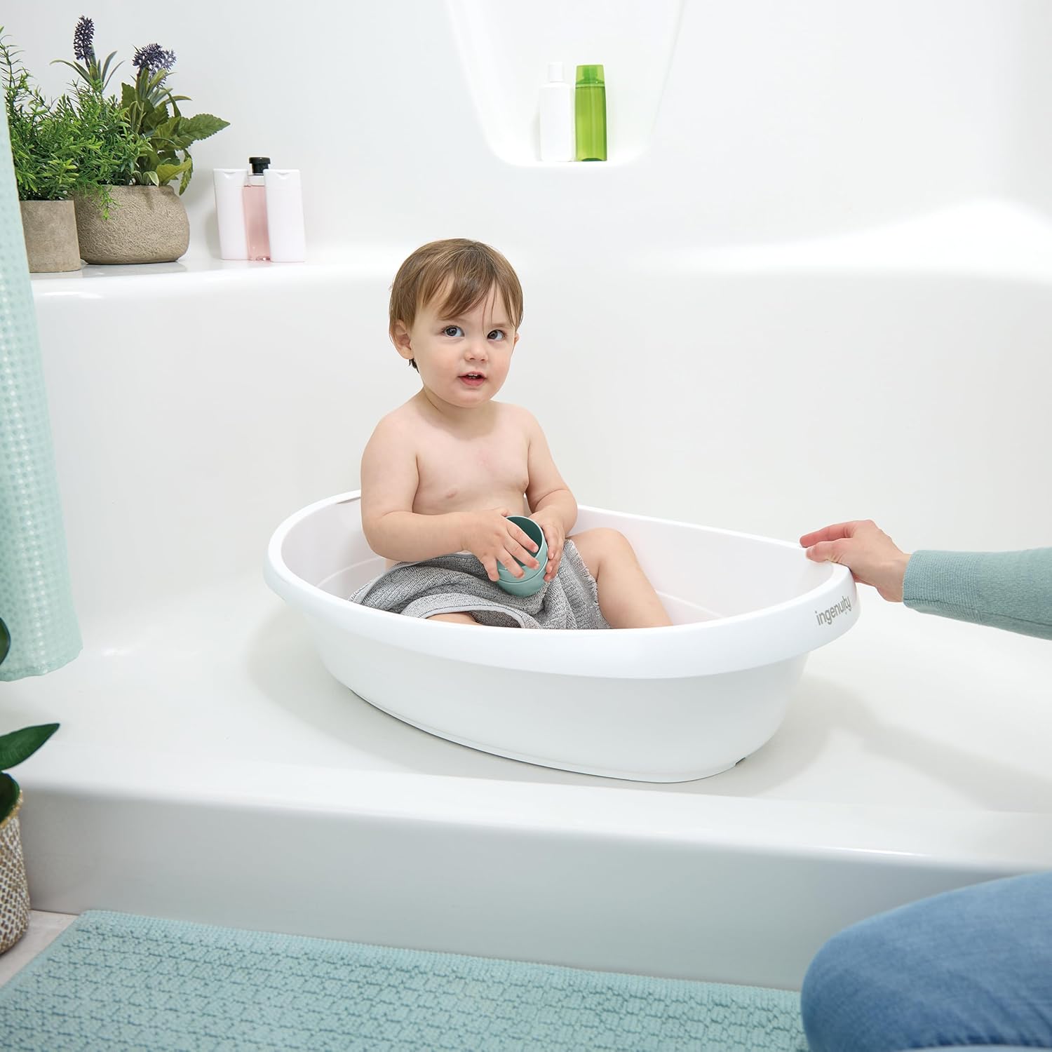 Watch baby grow from fully supported baths to bath time fun all in the same comfy baby bath tub. The Ingenuity Room to Soak 4-in-1 Tub gives parents 4 simple stages to support baby as they grow into upright seated bathers. A unique wide sling design cradles baby for their first baths and supports them as they slowly begin to explore bathtime from a safe, angled recline. The sling is machine-washable and quick-drying so it’s easy to keep ready for use. A support seat provides comfort as baby begins to enjoy bathtime in an upright seat. When they’re ready, the support can be removed so toddler has more room for bath time fun. The bath time fun can begin with something as simple as the included pour and rinse cups, to make baby giggle as you get them clean. The drain plug makes it easy to end bath time while the bathtub’s comfortable design helps make baby happy to return.
