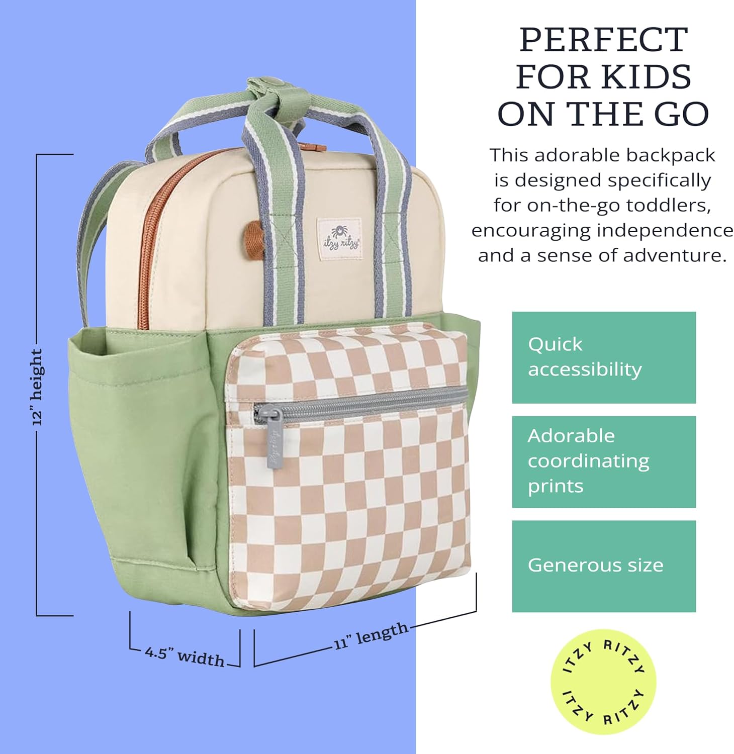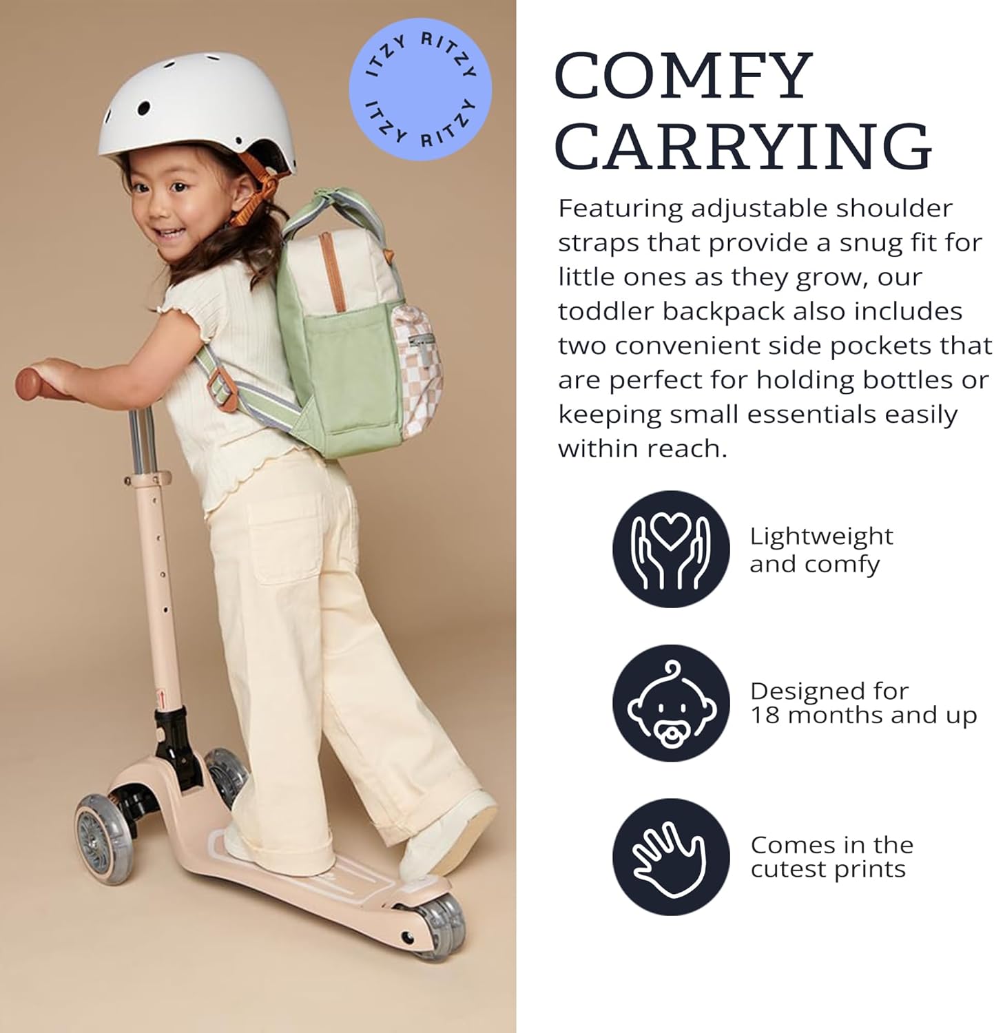 Your little one will travel in style with our adorable and functional toddler backpack! Designed specifically for on-the-go kids, the Itzy Ritzy toddler backpack measures 11″ W x 4.5″ D x 12″ H and features a spacious main compartment that includes a wipeable fabric lining and name label on the inside of the bag. The backpack features two soft, adjustable shoulder straps and the top handles snap together for easy carrying. Two side pockets are perfect for holding water bottles and sippy cups. The front of the bag features a large easy-access zippered pocket and a convenient side loop to keep your toddler’s favorite toys close. Encourage their independence with a backpack to call their own!