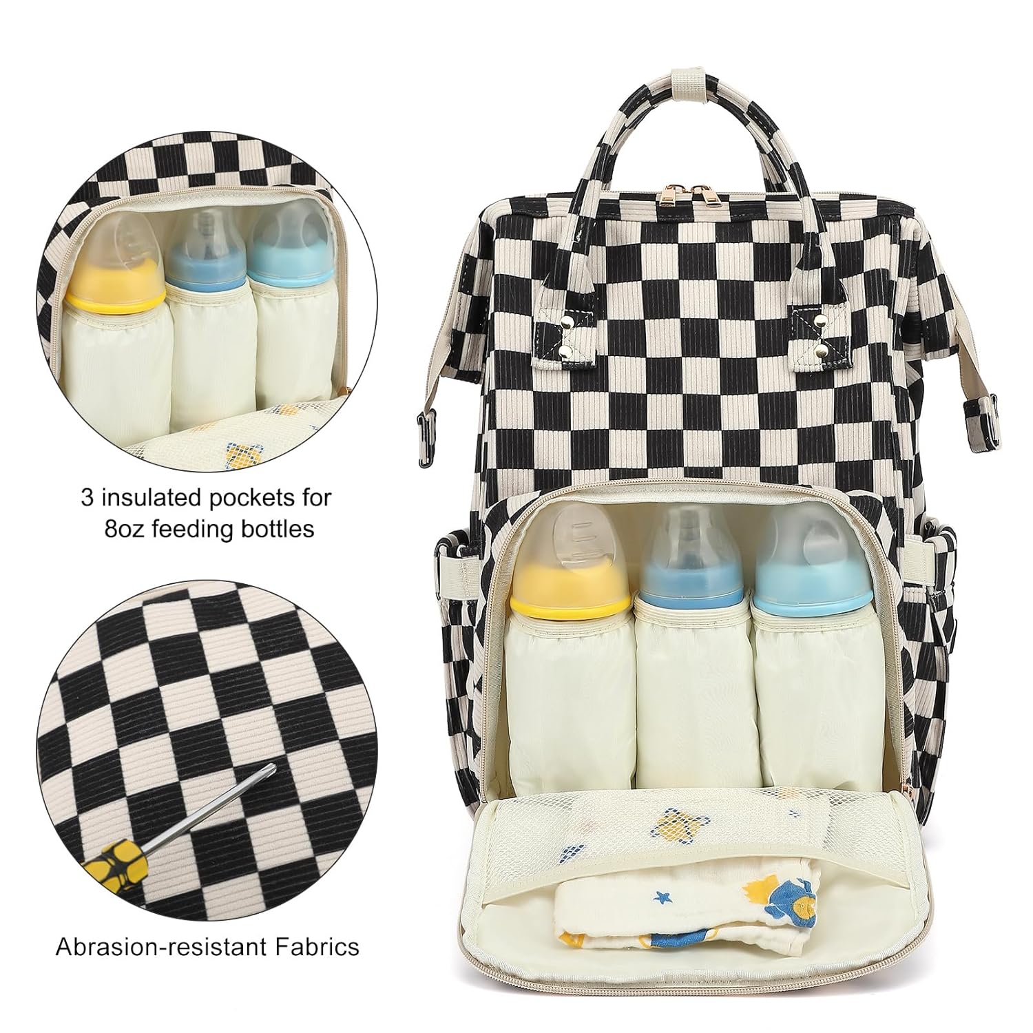 【Large Capacity】Size: 11.8L x6.3W x 16.5H inches; diaper backpack has a wide-opening main compartment for all most baby essentials, 2 side pockets for tissue and bottle, and a front compartment with 3 insulated feeding bottle pockets.