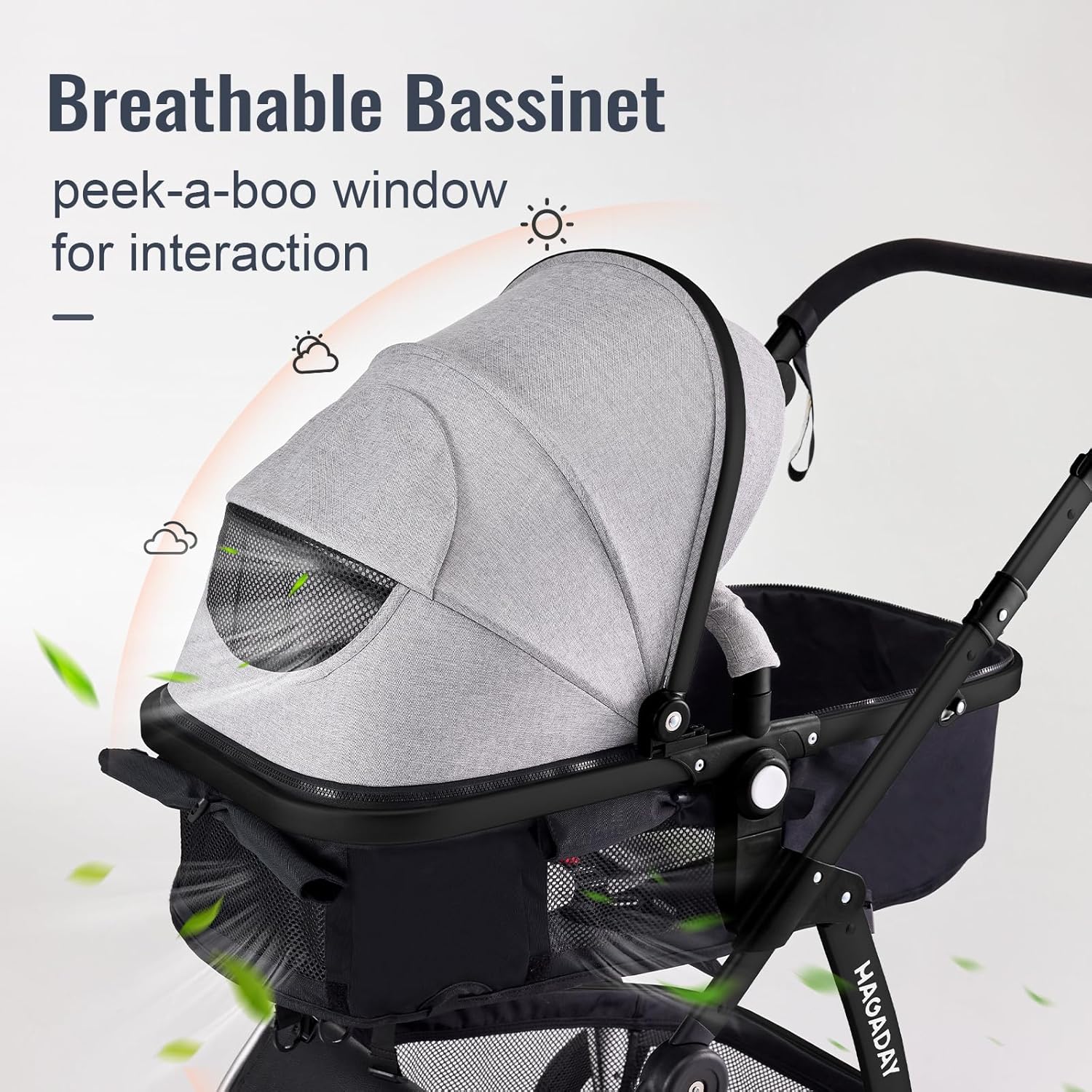 SUPERIOE BABY CARRIAGE: The Hagaday baby stroller surface is made from baby-friendly fabric that is skin-friendly and breathable. The soft cushion in the baby bassinet ensures comfort, and a foot cover provides warmth during colder weather.
