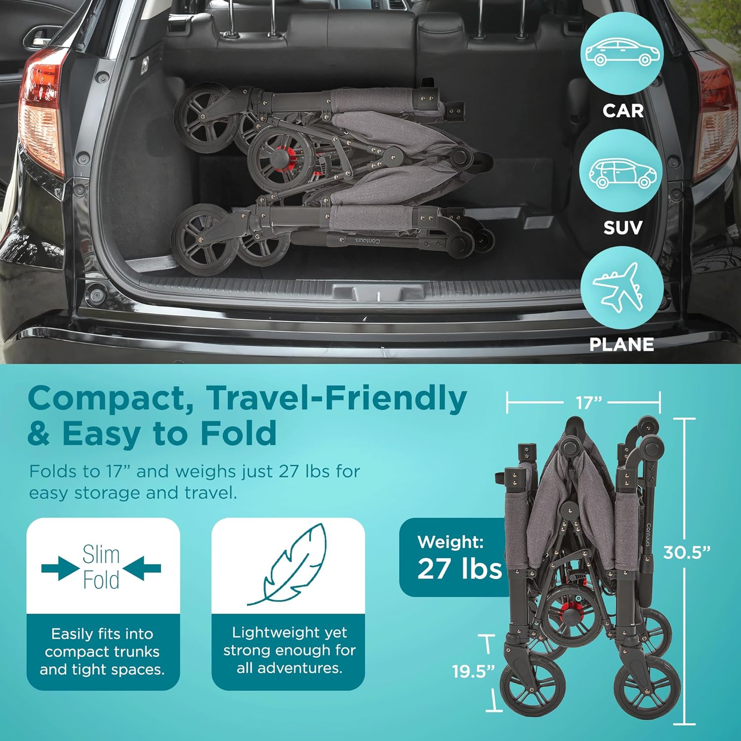 Lightweight Yet Durable Kid Wagon – Weighing only 27 lbs., its ultra-light, strong carbon steel frame supports up to 110 lbs. The compact fold (19.5”L x 17”D x 30.5”H) offers easy storage and transport, making it the ideal stroller for active families