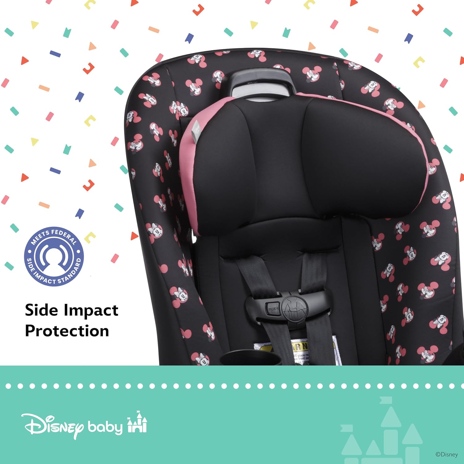 Bring the magic of Disney on every ride with the Disney Baby Ellaris Convertible Car Seat for babies and toddlers. With 3 ways to use, this car seat provides flexibility and comfort for your growing baby with Rear-Facing Infant (5-30 lbs.), Rear-Facing Toddler (30-40 lbs.), and Forward-Facing (30-65 lbs.) positions. The slim design fits 3 across the back seat of most vehicles so its perfect for growing families. The hook-style LATCH makes installation easy. An adjustable 5-position headrest and harness ensure the car seat grows with your child, from baby to big kid. Airplane ready, its compact design makes for a better travel experience from the airport through the flight. The Disney Baby Ellaris Convertible Car Seat was engineered and tested to meet or exceed federal safety standards. It also meets the federal Side Impact standard.
