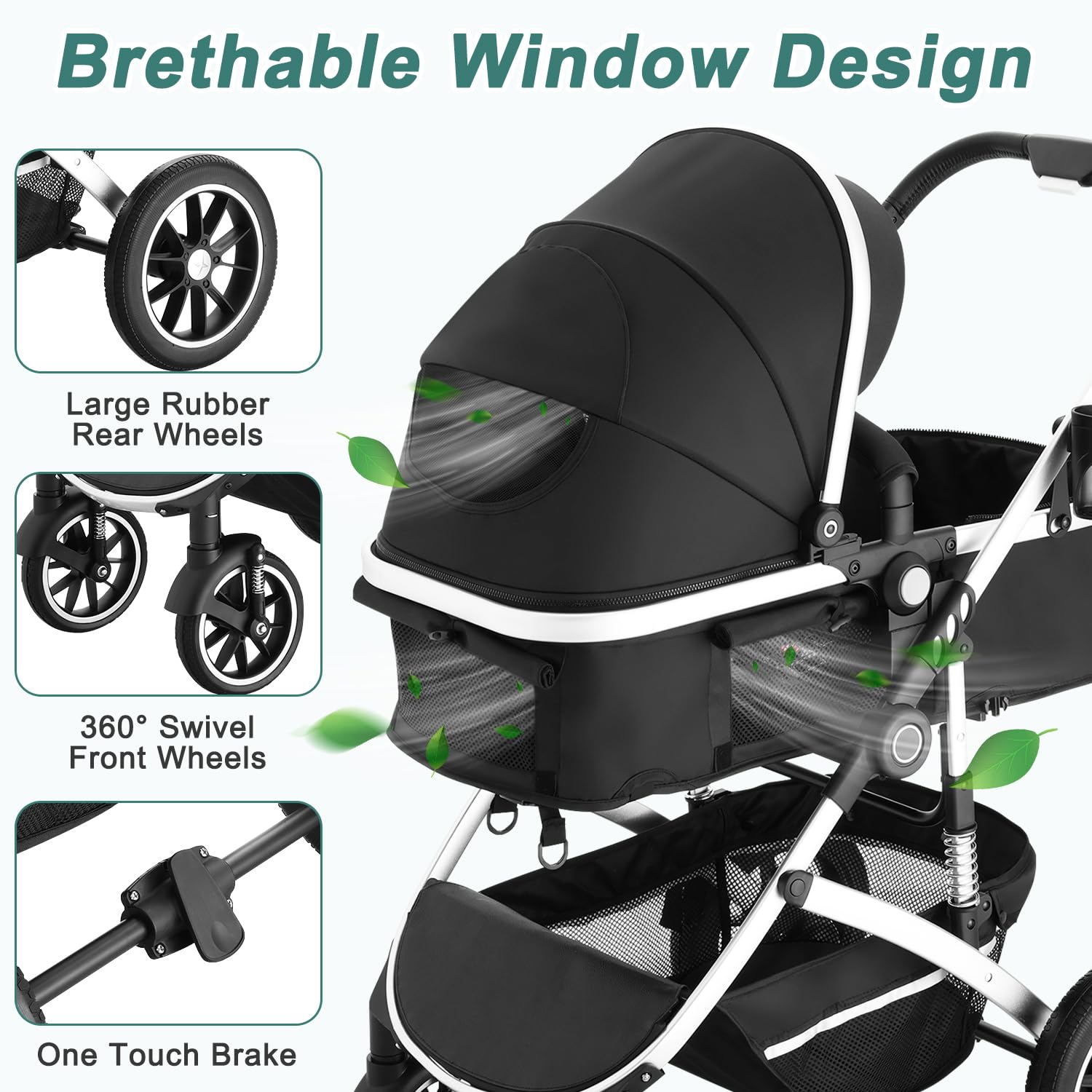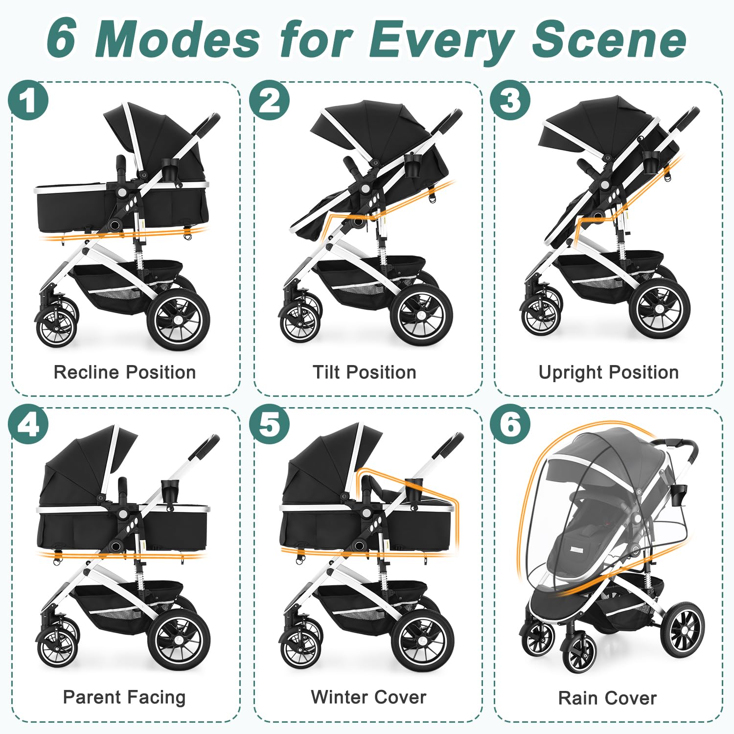 ADJUSTABLE AND REVERSIBLE: The bassinet of this infant stroller offers versatility with 3 adjustable incline angles, allowing for inward or outward facing positions; along with a detachable foot cover and five-point safety harness for enhanced safety