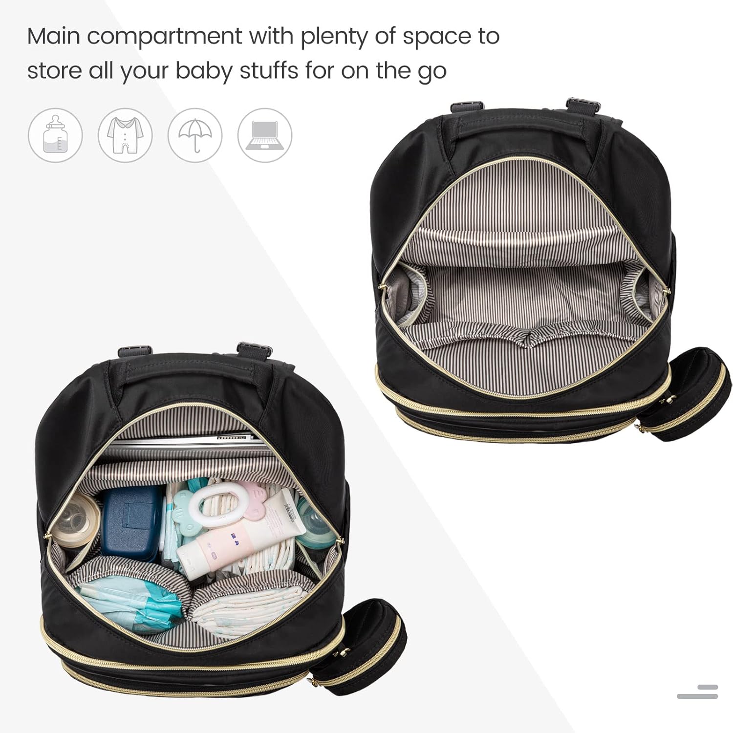 WELL ORGANIZED: The diaper bag backpack has 18 pockets, 2 insulated holders fts 5 oz to 10 oz milk bottles, 2 side pockets will hold your water bottle and wipes, hidden pocket in the back for stashing phone or wallet, there are so many pockets and neat storage compartments within and outside of the diaper bag is so many configurations to suit parents’ needs.
