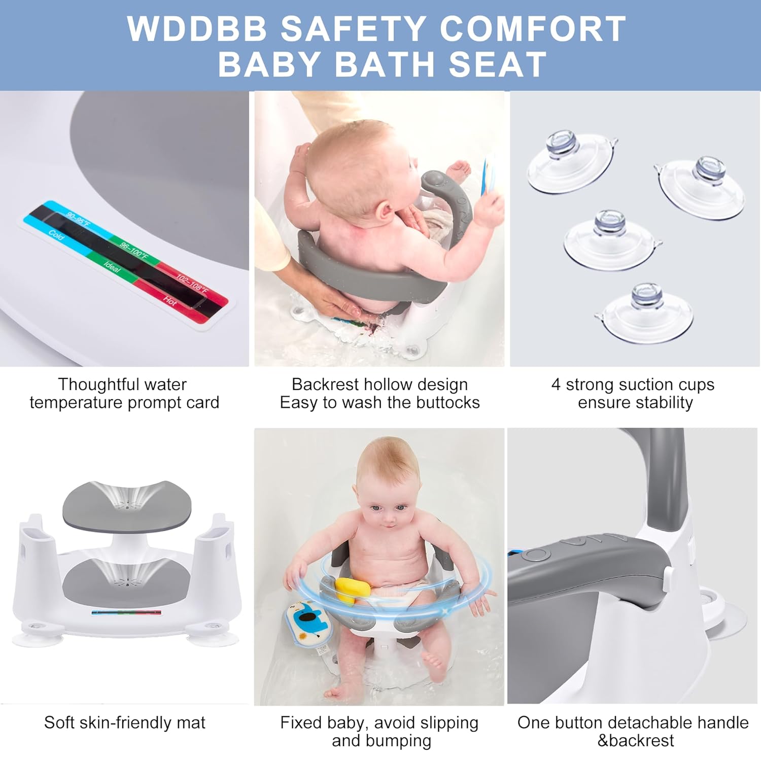 Wddbb baby bath chair features a 360° wrap-around design that fits snugly and protects baby.The hand guards can be opened or closed, making it easy for baby to sit up and clean all parts of the baby’s body.One-touch removable handle + backrest for easy setup, portability and storage.Please note: Wddbb Baby Bath Seat, with 4 strong suction cups to secure the seat, needs to be suctioned on a smooth flat surface, non-slip bathtubs with ripples cannot be suctioned!