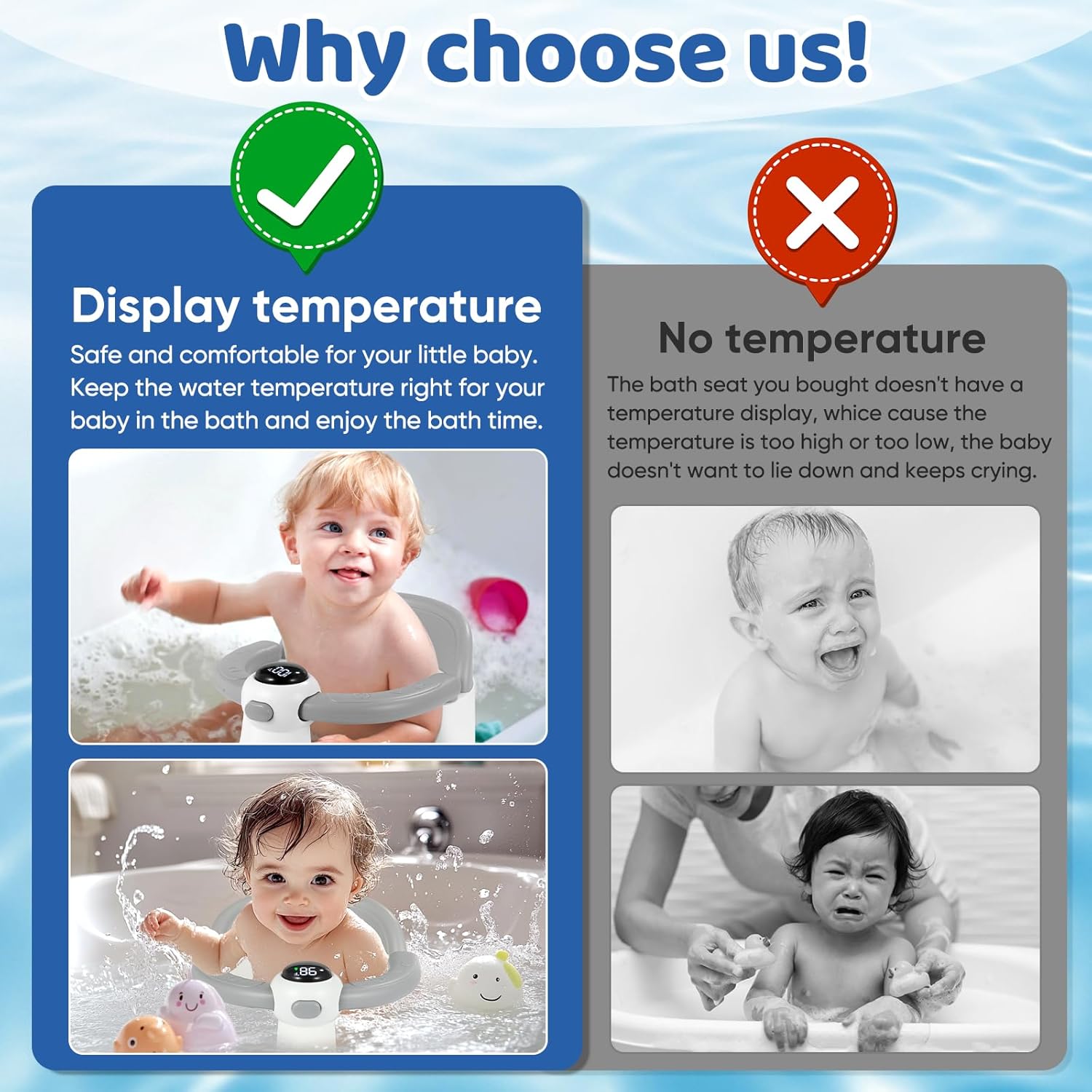 【Built-in Thermometer Design】Are you in need of the ultimate essential for mothers? Look no further than this indispensable baby bath seat with temperature display. You don’t have to buy an extra baby shower thermometer or worry about losing your thermometer. With this bath seat, you can monitor the water temperature changes at any time and let your baby bathe in a safe and comfortable water temperature