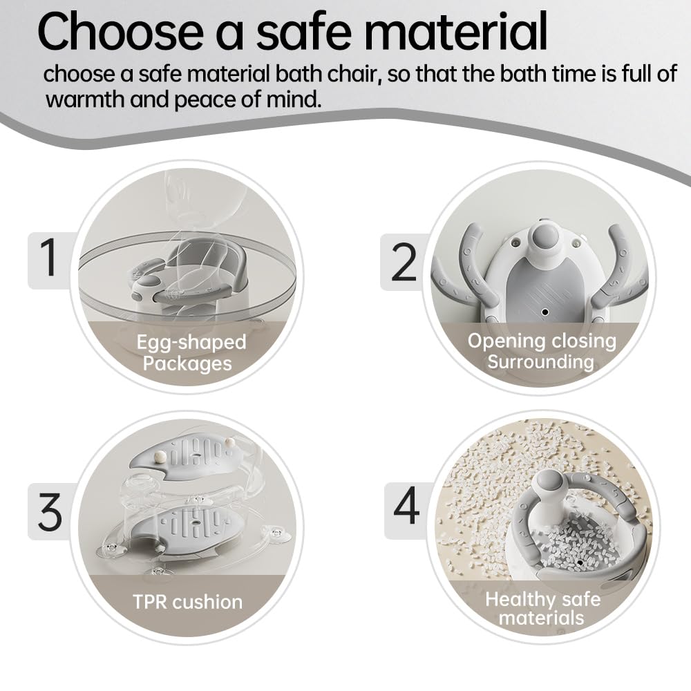 【Safety & Comfort】: Our baby bath seat is made of high quality PP and TPR, 100% safe, skin-friendly, easy to clean, certified by CPSC, the upgraded seat design ensures that water can be reached in all directions for proper cleaning! The bottom of the baby bath seat is equipped with four strong suction cups,providing all-round stability to ensure the safety of the baby.