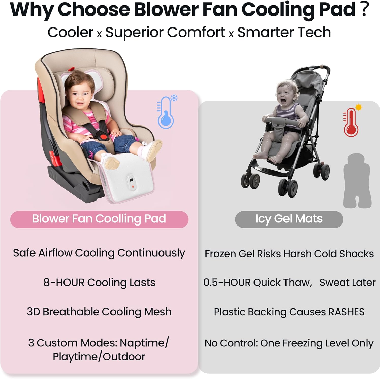 [Breathable 3D Mesh Fabric+ Continuous Power]Unlike ice gel pads that shock with sudden cold and fade quickly, Our car seat cooler pad for babies uses dual Blower Fans to push active airflow through breathable 3D mesh, gently targeting baby’s high-heat & rash-prone areas.Zero skin irritation, lasting airflow, and sweat-free comfort—keeping your baby happily cool wherever you go.