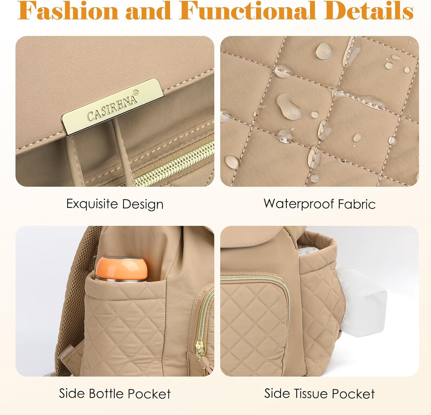 CASIRENA Diaper Bag Backpack, Small Baby Travel Bag, Stylish Mom Daypack, Water-Resistant Diaper Backpack, Cute Baby Bag for Girl Boy with Changing Pad,Stroller Buckles,Insulated Pockets (Khaki)