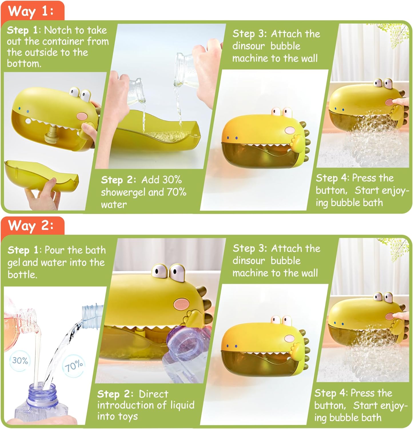 3.STRONG SUCTION CUPS:This bath toys with 3 suckers,super strong suction cups fasten your dinosaur baby bubble machine to the bath or any bathroom surface.Baby will enjoying the bath time at ease