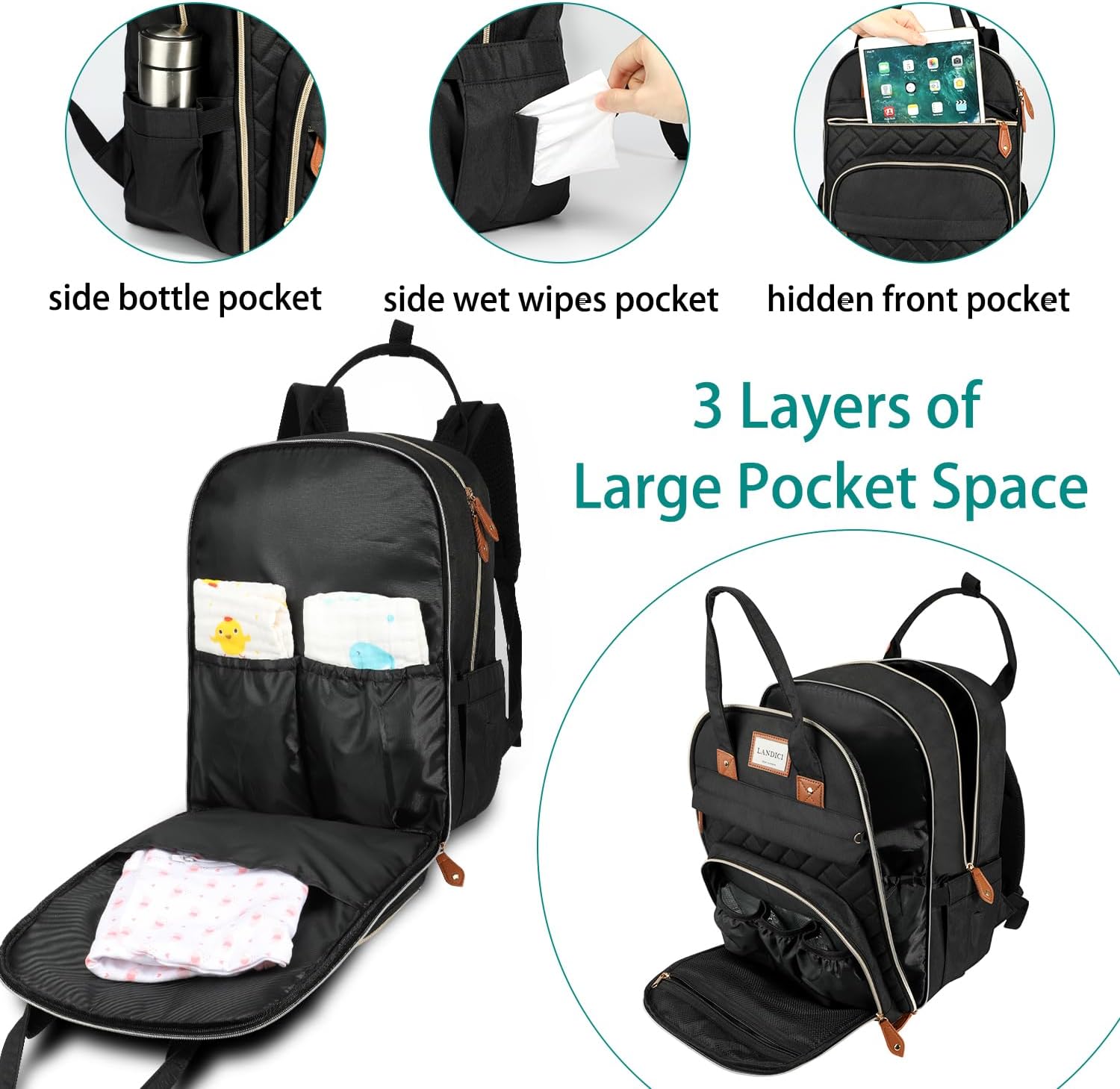 MULTIFUNCTIONAL POCKETS: 2 hidden zippered pockets are convenient for storing other small baby items. The front zippered pocket contains 3 insulated pockets (for baby bottles). 2 side pockets on the side of the diaper bag for water bottles and wipes. Multiple pockets with easy slip zippers make this diaper changing backpack easily accessible with one hand
