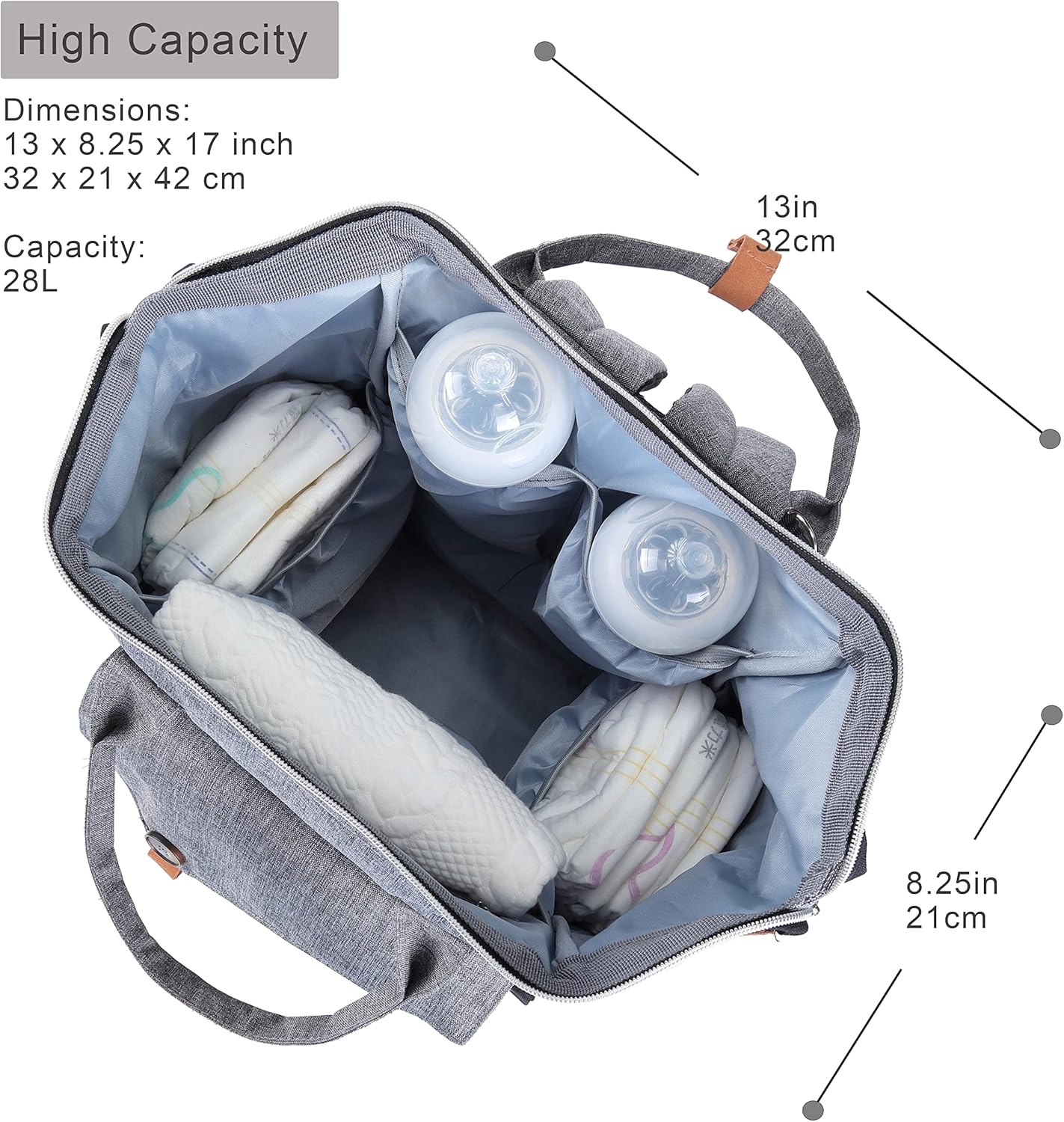 Included: Diaper bag backpack (17″ x 13″ x 8.25″, 28L capacity), 2 detachable stroller straps with hooks so you can hang on stroller, a foldable easy to carry changing pad (23″ x 13.5″).