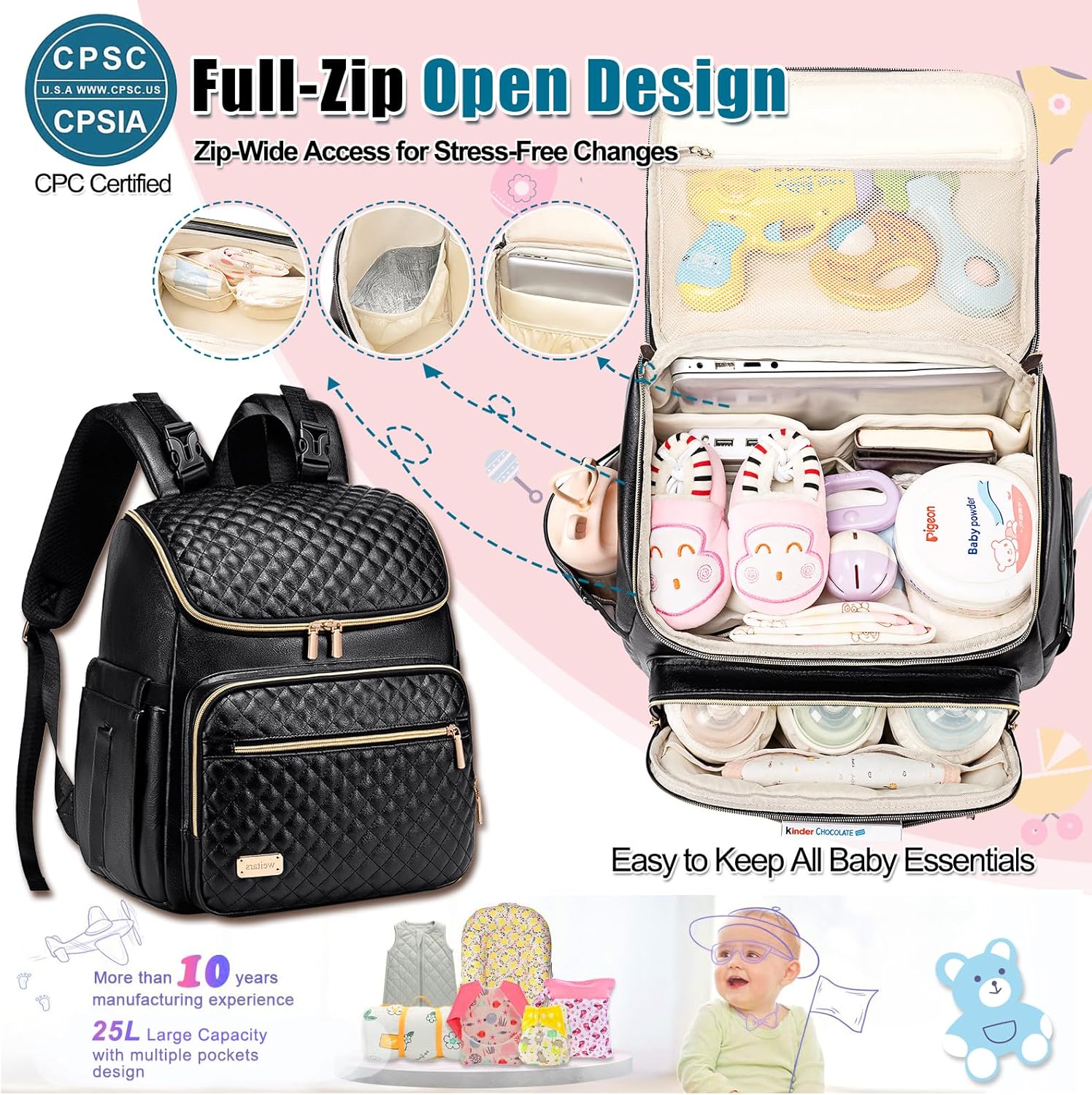 【Multi-Functional for On-the-Go Parents】Travel diaper backpack designed for convenience, baby backpack has stroller straps for hands-free carrying and a luggage sleeve for travel. The wide-mouth opening + dual zippers baby bag for mom make packing effortless, while the included changing pad (24″x15.7″) ensures clean diaper changes anywhere. Made with water-resistant faux leather (PU) and waterproof lining, it’s both durable and easy to clean.
