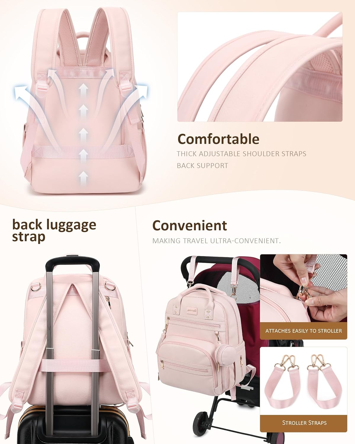 4. Comfortable & Versatile Carrying – Designed with padded shoulder straps, a convenient top handle, stroller straps for hands-free convenience, and a back luggage sleeve to slide over suitcase handles. This backpack diaper bag provides comfort and ease, keeping essentials readily accessible for parents on the go.