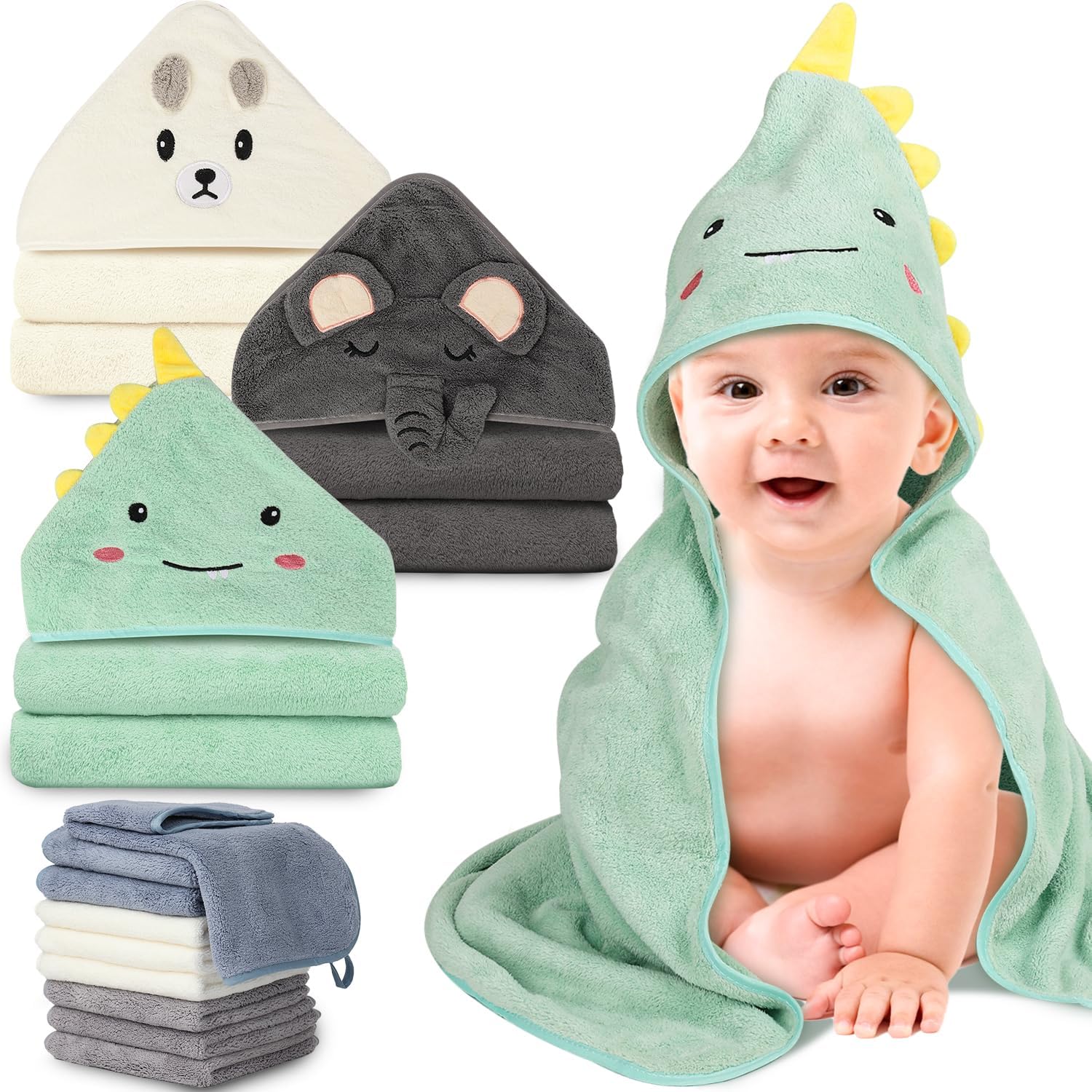 Cute Animal Shaped Design: Our 3pcs children’s bath towels come in 3 different cute animal-shaped designs, 1pcs white teddy bear+1pcs gray elephant+1pcs green dinosaur, perfect for your baby boy
