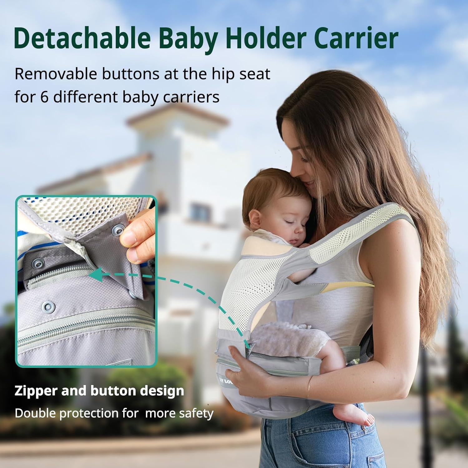 6-in-1 Adjustable Detachable Hip Carrier: 6 carrying positions toddler carrier, when detached, Horizontal/Facing Out/Facing In ways; when not detached, Facing Out/Facing In/Back Carry ways
