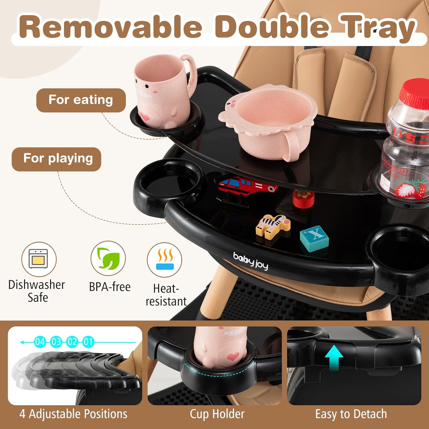 4-Stage Adjustable & Detachable Tray: The removable tray makes the cleaning process a breeze. What you need to do is simply unlatch the convenient plate and move it to the sink for a thorough rinse. And 4 adjustable positions can provide more space for fast-growing children.