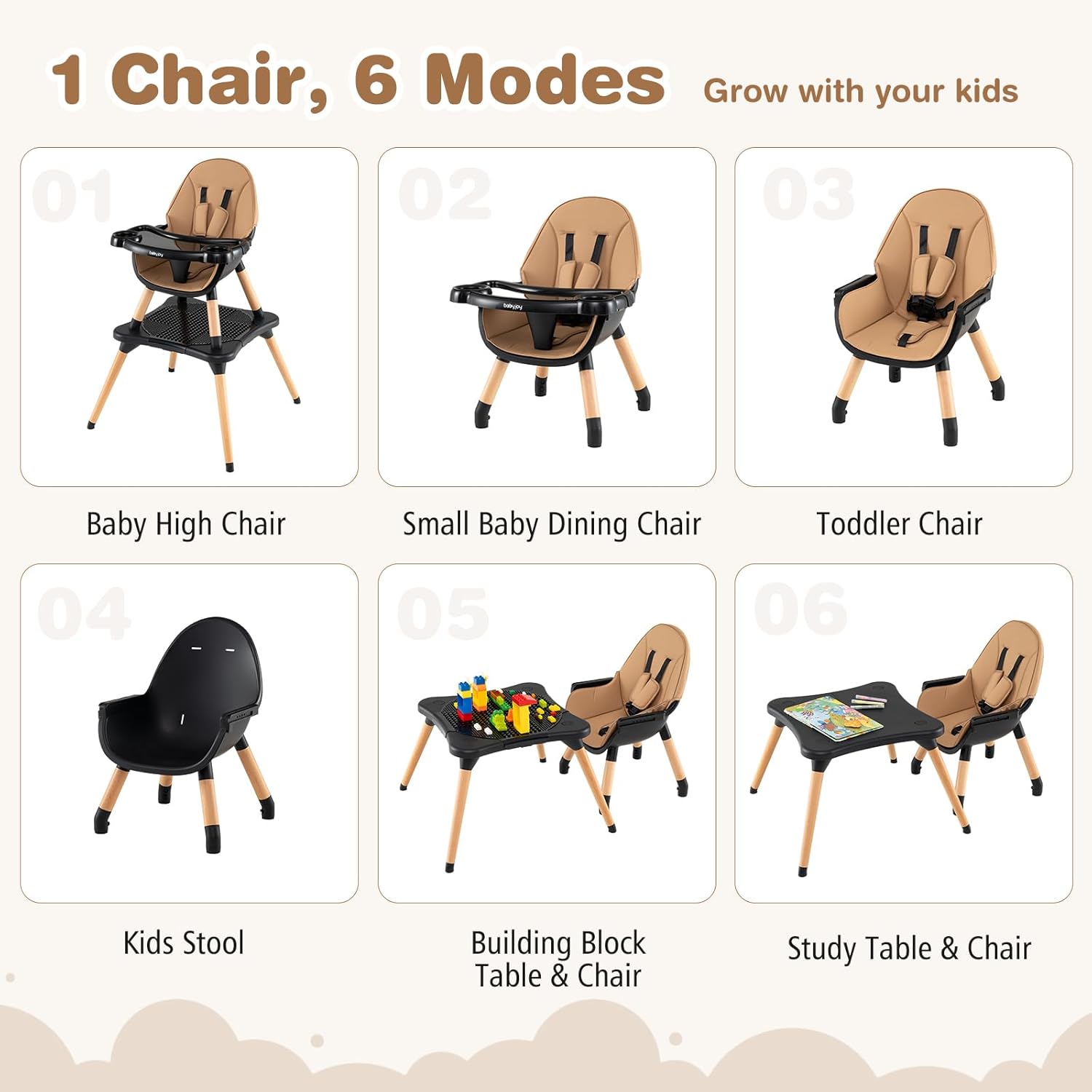 6-In-1 Convertible High Chair: We all know that children grow so fast, so our chairs are designed to be easily converted into a high chair, toddler booster seat with guardrails, kids table and chair set, building block table and chair set, infant floor seat, or an ordinary stool. The 6-in-1 design meets the diverse needs of babies at every stage of their growth.