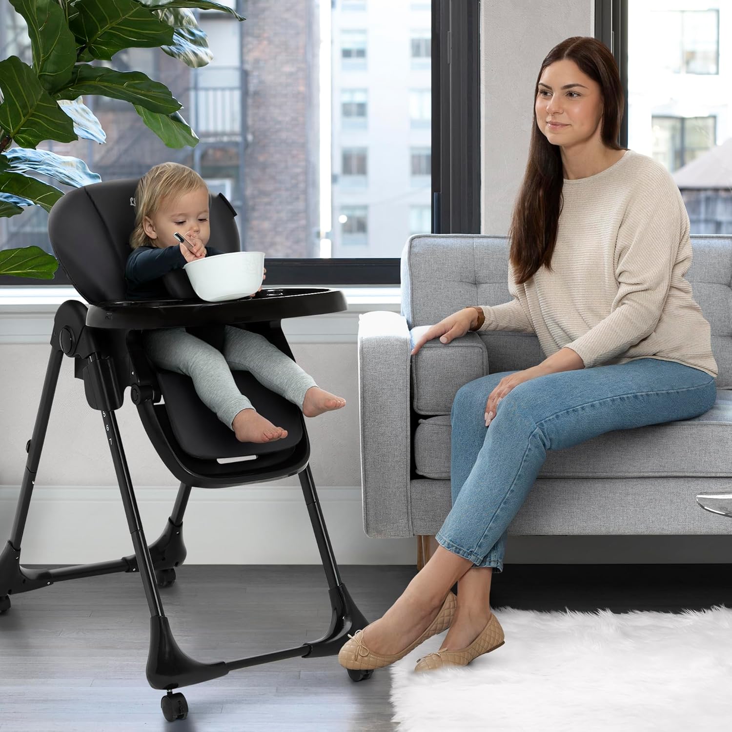 SLIM FOLD: Ultra-slim folding high chair fits in compact spaces | Folds flat for storage | Stands on its own when folded | Equipped with 4 locking wheels to easily move around your home | Meal tray clips to back of the high chair when folded