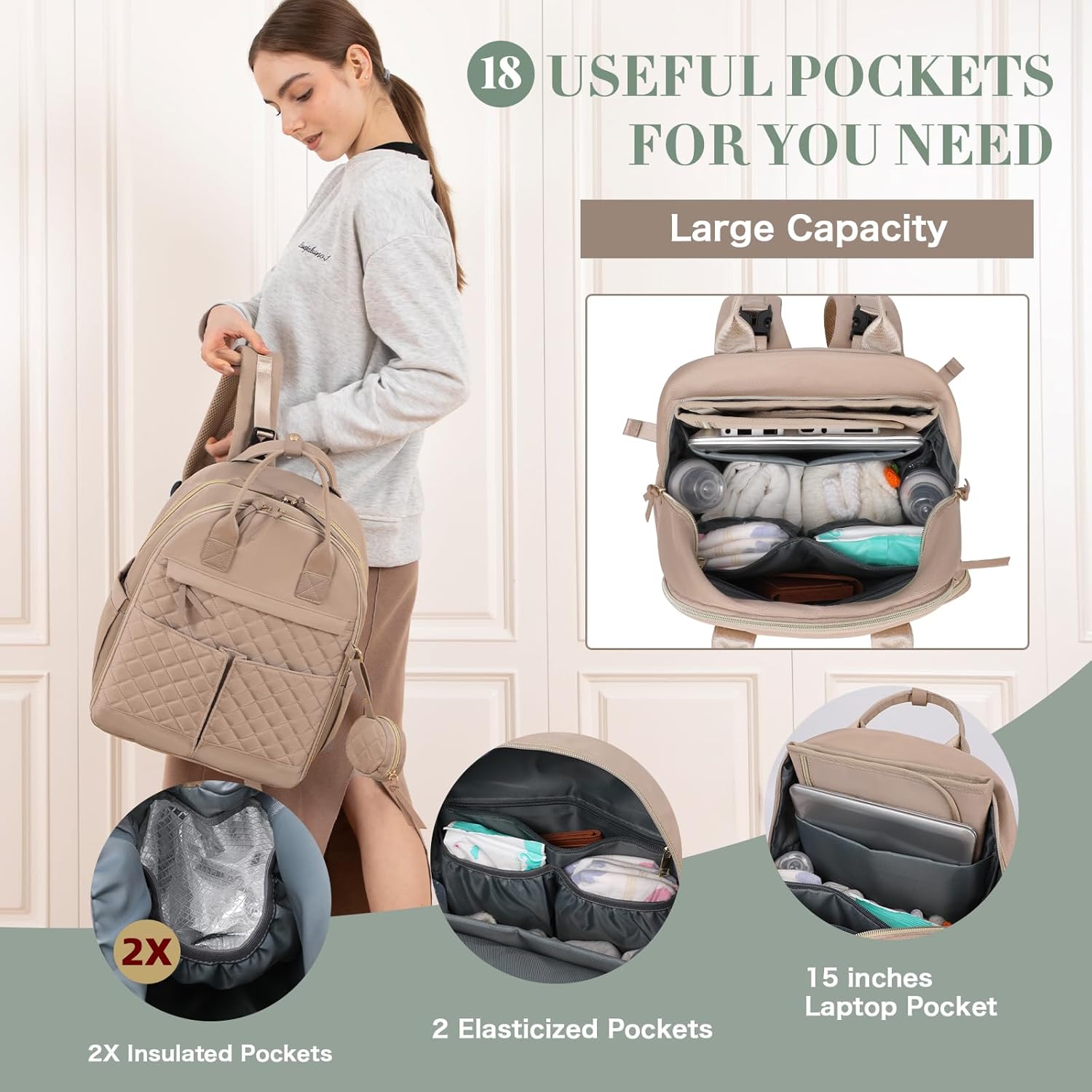 4 Ways to Use: Versatile as a travel backpack, attached to a stroller, secured to the luggage strap or top handle carry. This nappy bag can be worn as diaper bag organizer, maternity hospital bag. Breathable, durable, and adaptable from baby to toddler