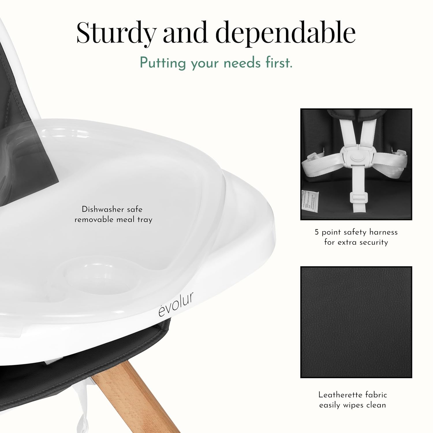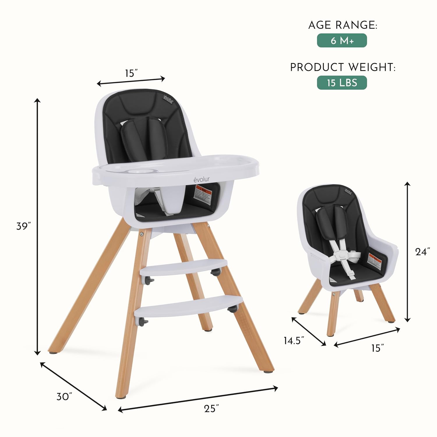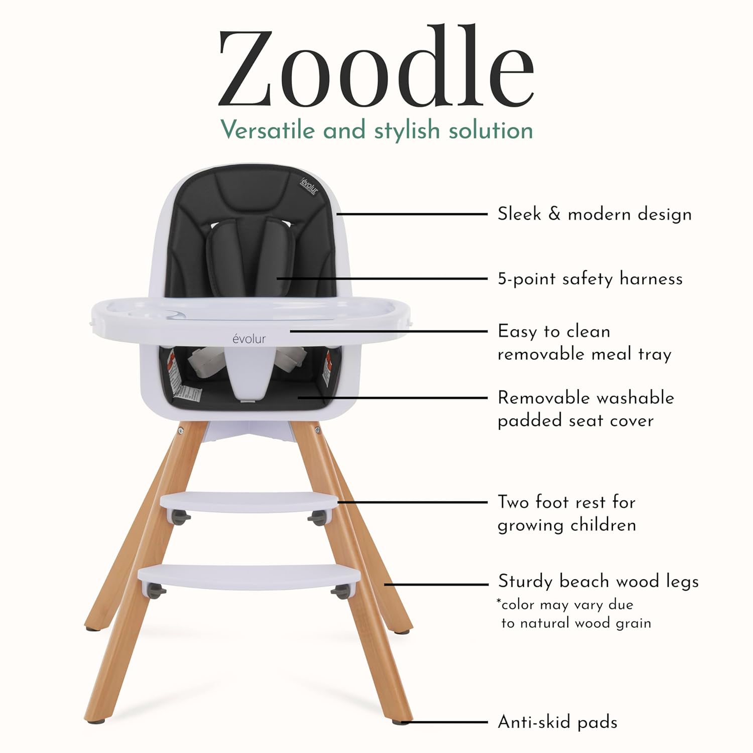 The moment when your child starts eating on their own is a major milestone make it even more special with the Evolur Zoodle 2-in-1 High Chair A winner at the 2022 NATIONAL PRODUCT PARENTING AWARDS, the Zoodle comes with fabulous convertibility options, a focus on safety, and exciting features that make it a must-have.The award-winning Evolur Zoodle High Chair keeps pace with child’s changing needs. Starting as a high chair, you can easily convert it into a toddler chair as your child gets more independent. Bid goodbye to safety concerns The Zoodle has a five-point safety harness with a padded shoulder belt cover, and non-skid feet. It meets ASTM f-833-18 standards. Key design materials include sleek beech wood and sturdy hygienic food grade PP material. The padded seat is made of durable, lightweight and non-toxic PU fabric. The Zoodle comes with a 2-position adjustable double feeding tray and two foot-rests to keep pace with your growing little one Cleaning post meal mess has never been this easy: just wash the removable seat in warm, soapy water.High chair dimensions are 30Lx25Wx39H inches and it weighs 15 lbs and the age range is six months+. Choose from five exciting finishes – mint, pink, ivory, light grey, black & yellow.
