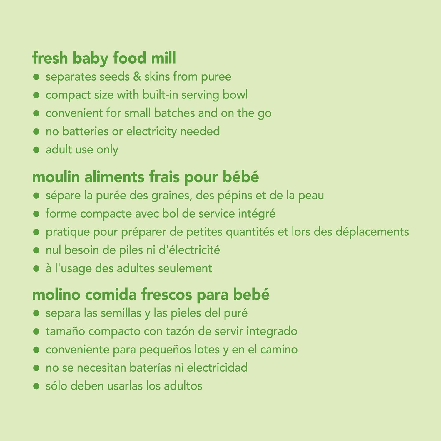 Baby can enjoy whole, fresh, and balanced purees with the Fresh Baby Food Mill. Parents can easily and conveniently make homemade baby food in small batches at home, or on the go. It separates seeds and skins from the puree without a lot of cooking preparation. The Fresh Baby Food Mill is compact in size, and no batteries or electricity are needed!”