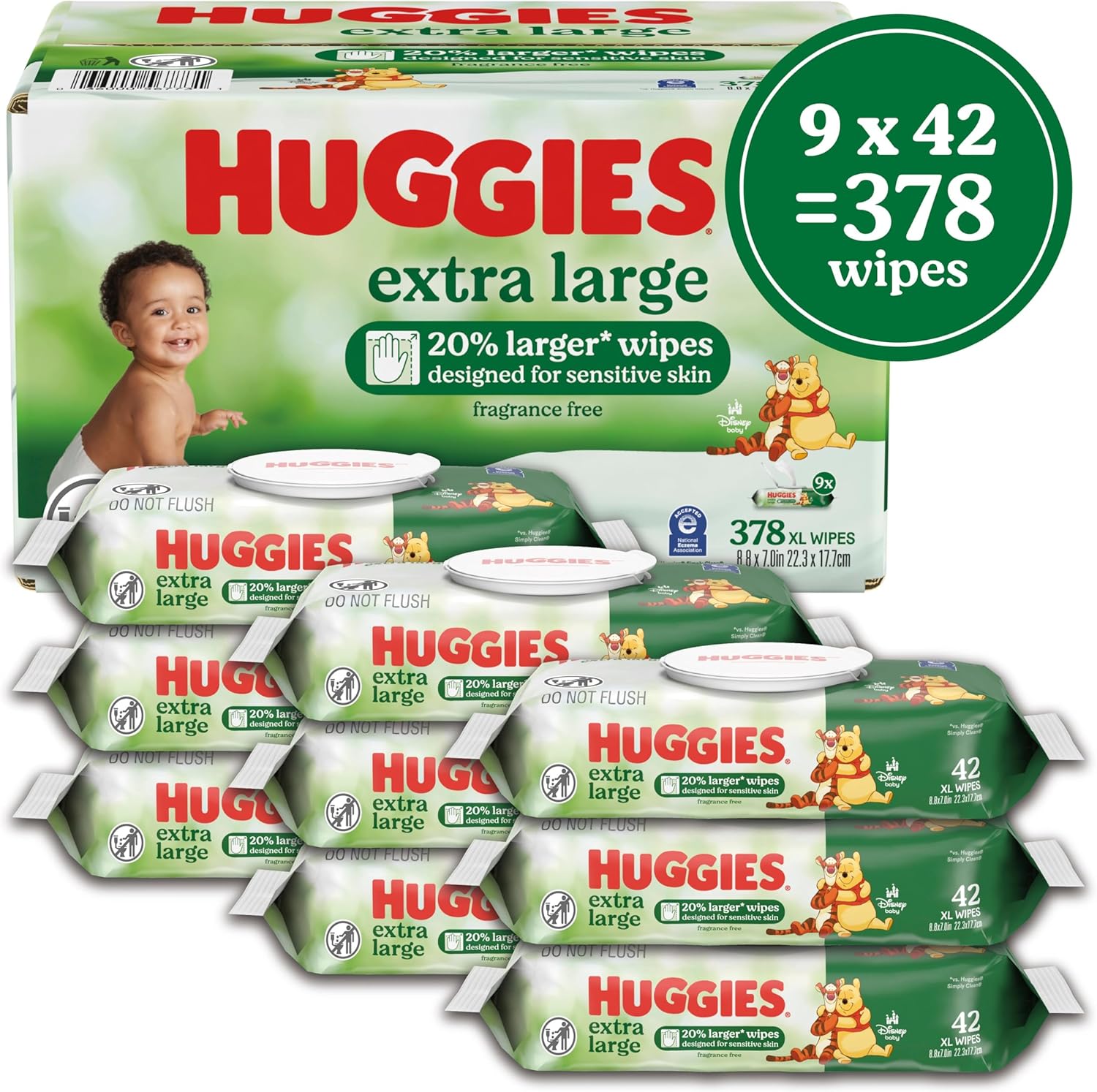 Huggies Extra Large: 9 flip-top packs of 42 XL unscented baby wipes (378 wipes total); packaging may vary
