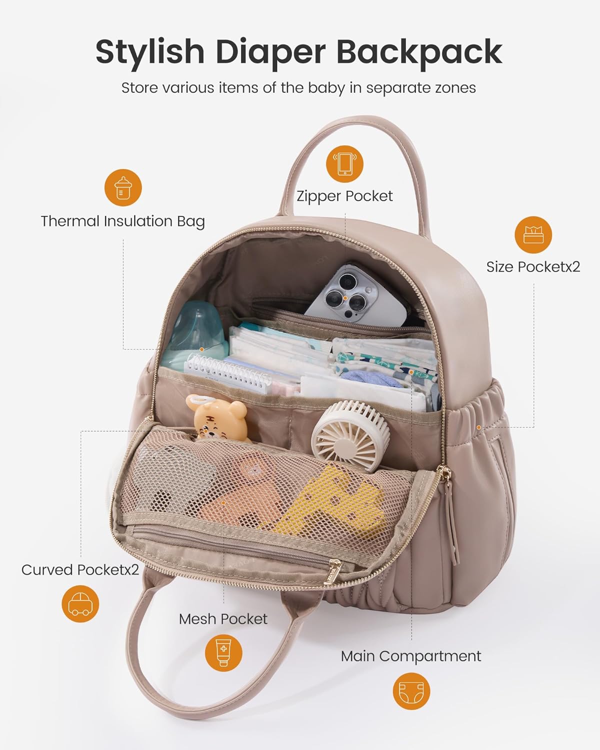 【Insulation & Portability】The diaper backpack is equipped with two temperature control bags inside, which are made of silver foil layers to effectively maintain the temperature of the baby bottle. At the same time, the back opening of the bag can hold diaper pads or hidden shoulder straps, and the adjustable shoulder strap design provides 4 carrying modes including crossbody bag or shoulder bag, backpack, handbag, and baby stroller bag