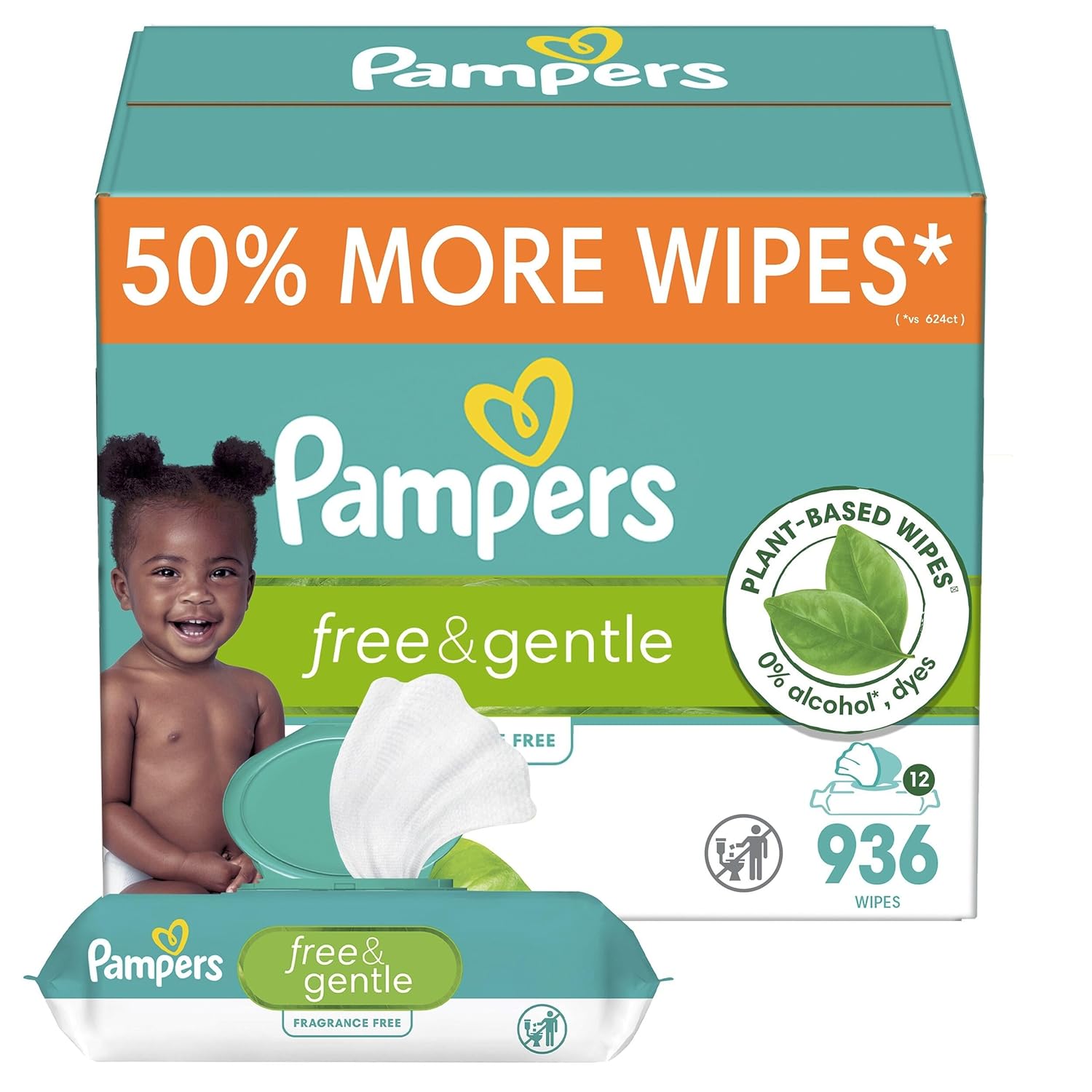 936 Wipes in 12 Packs of Pampers Free & Gentle Baby Wipes, Hypoallergenic, Unscented, 99% Water, 100% Plant Based Plastic-Free Baby Wipes