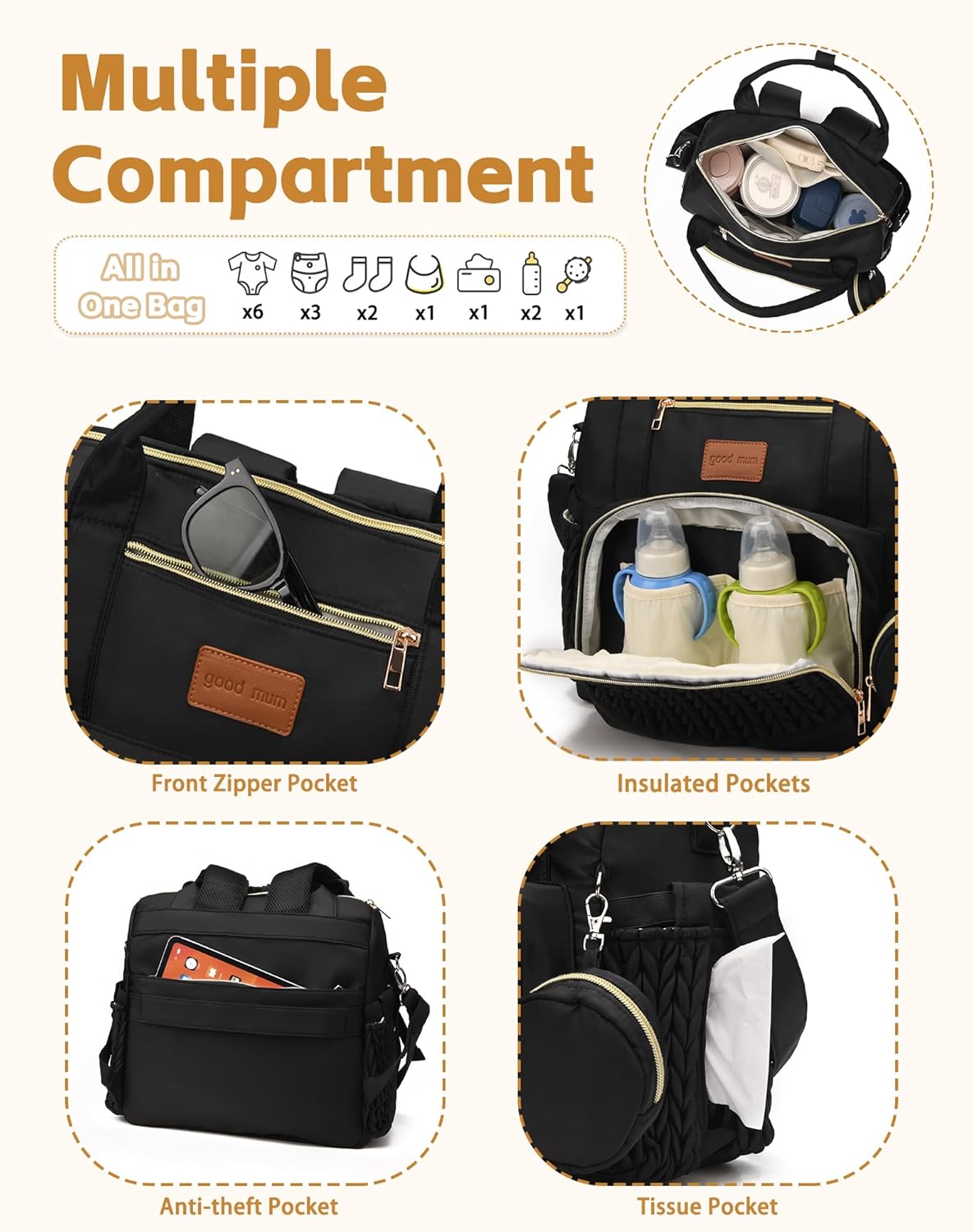 【3 Compartments & 16 Functional Pockets】Thoughtfully designed with a wide, easy-access opening so you can grab what you need in seconds, features a secure anti-theft back pocket for valuables such as IPAD , insulated bottle holders, waterproof pockets , and convenient side tissue pockets. Everything stays neatly organized, so you can focus on what truly matters—your baby.