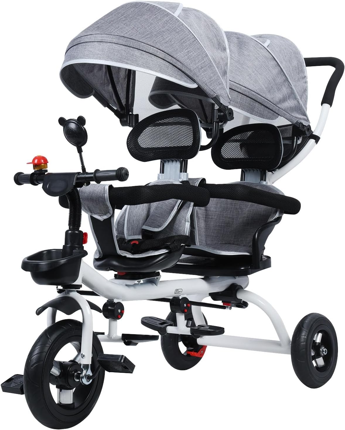 Baby Tricycle with Double Seat and Canopy, Children Tricycle with Bell, Mirror, Safety Harness, Anti-Rollover Shockproof Rubber Wheel Double Baby Stroller for 2-8 Years Old Kid Grey