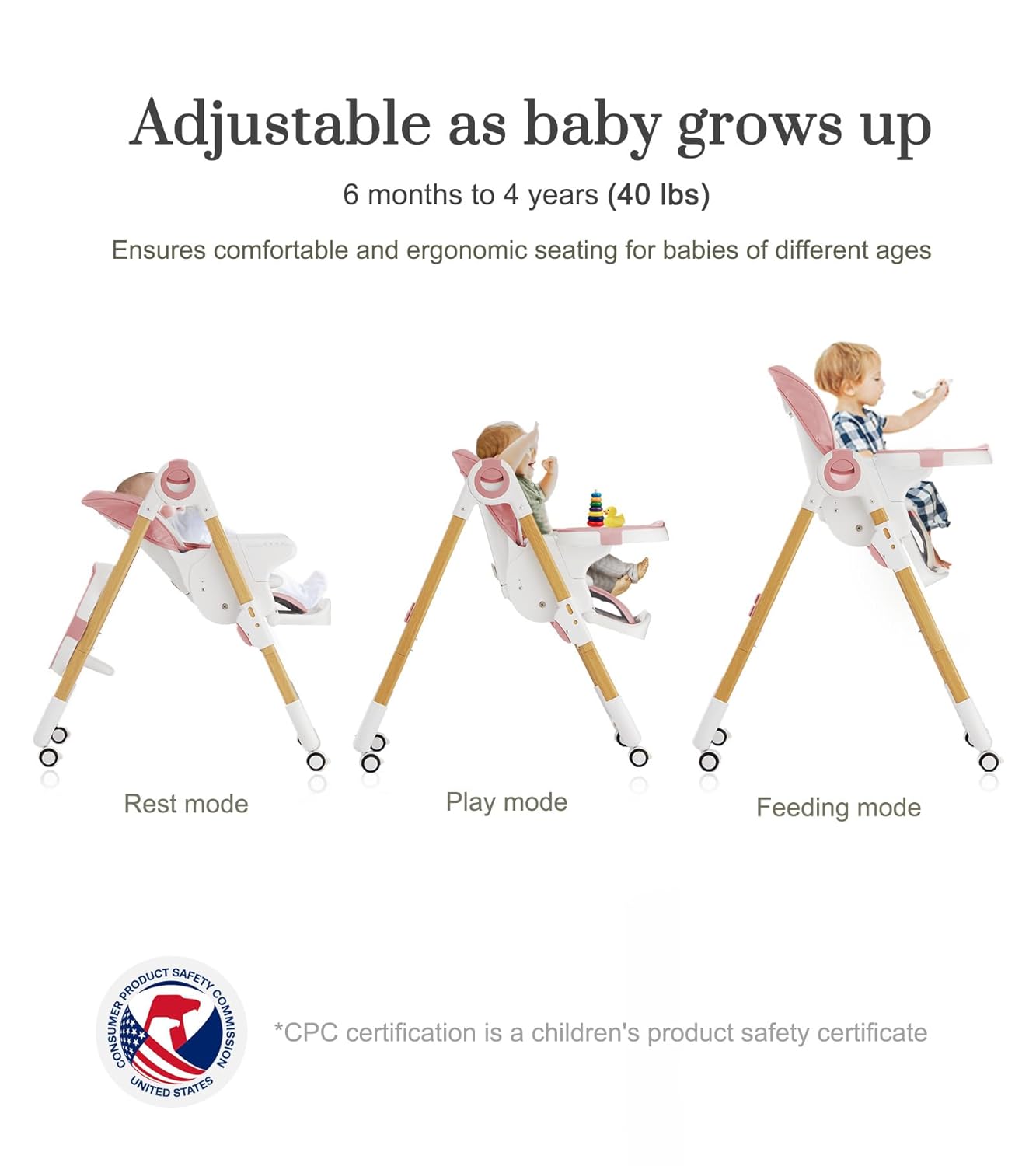 ADJUSTABLE HEIGHTS, BACKREST & PEDAL: Our high chairs for babies and toddlers has three-level foot adjustment, seven-level seat adjustment and four-level backrest adjustment, adapting to different heights and needs of babies. The use of buttons can be quickly adjusted and converted.