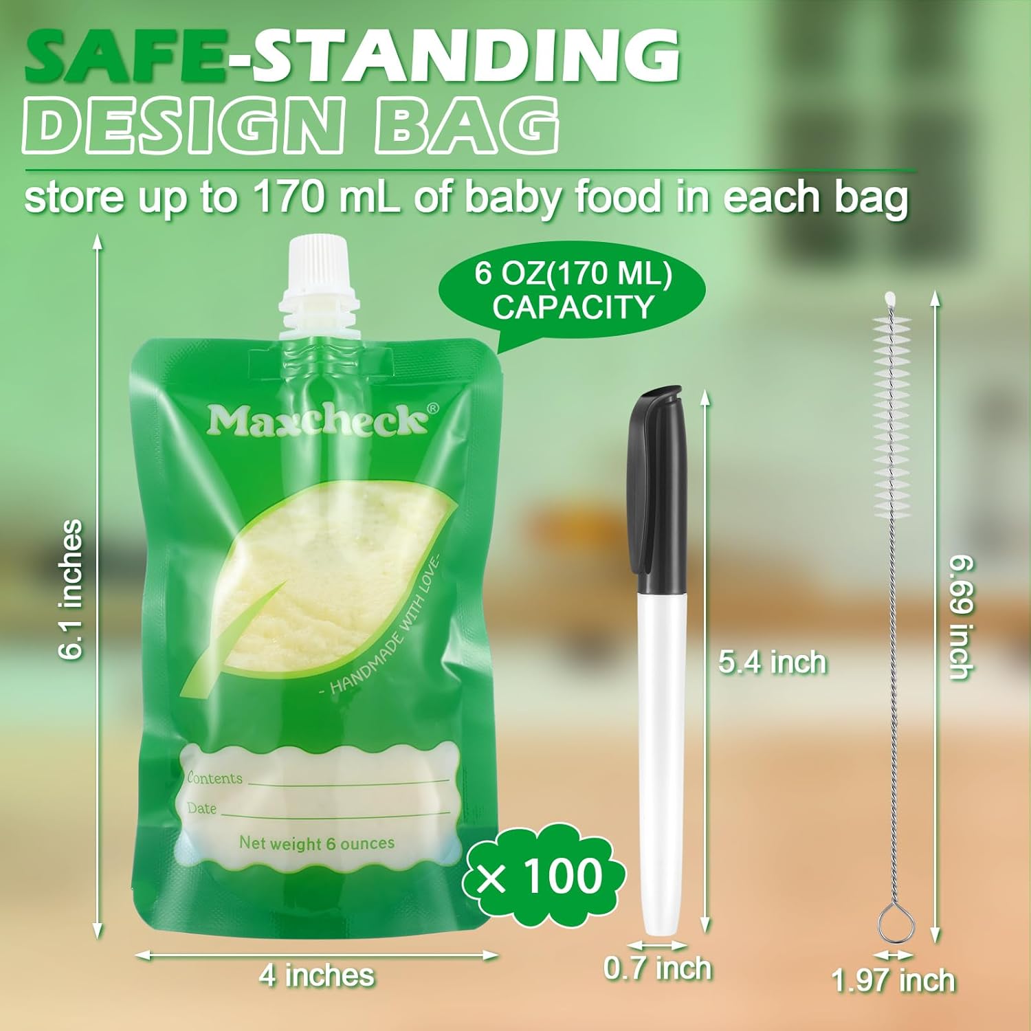 Complete Baby Food Pouch Maker Kit: you will receive 50 baby food bags, a baby food maker, a black pen, and a brush; These items make it simpler to package baby food, allow you to prepare meals ahead of time for your child, and save time by making stock