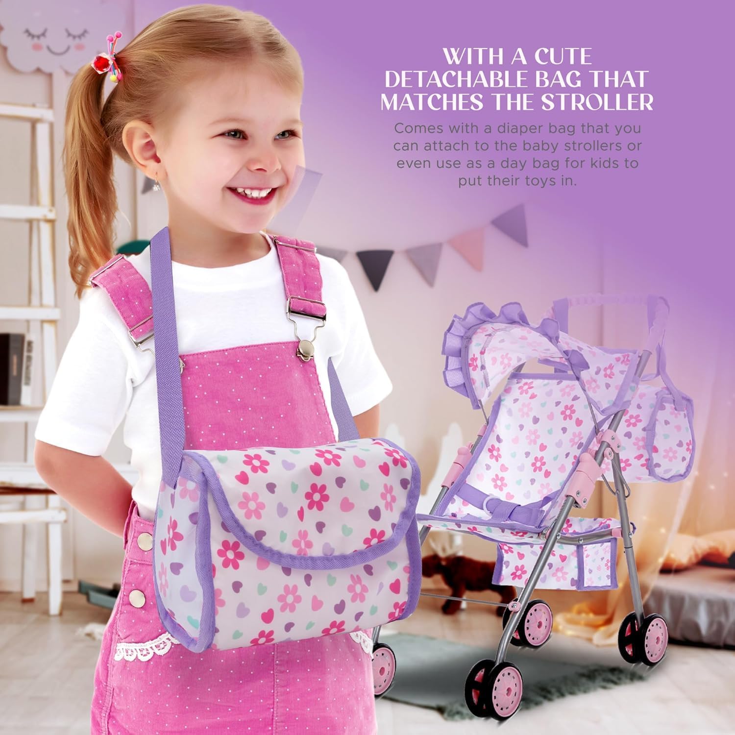 Matching Purple Floral Bag & Ample Storage: Comes with stylish diaper bag and spacious storage basket to keep doll essentials organized; perfect for realistic play teaching tidiness and easy to disassemble for travel or compact storage for convenience