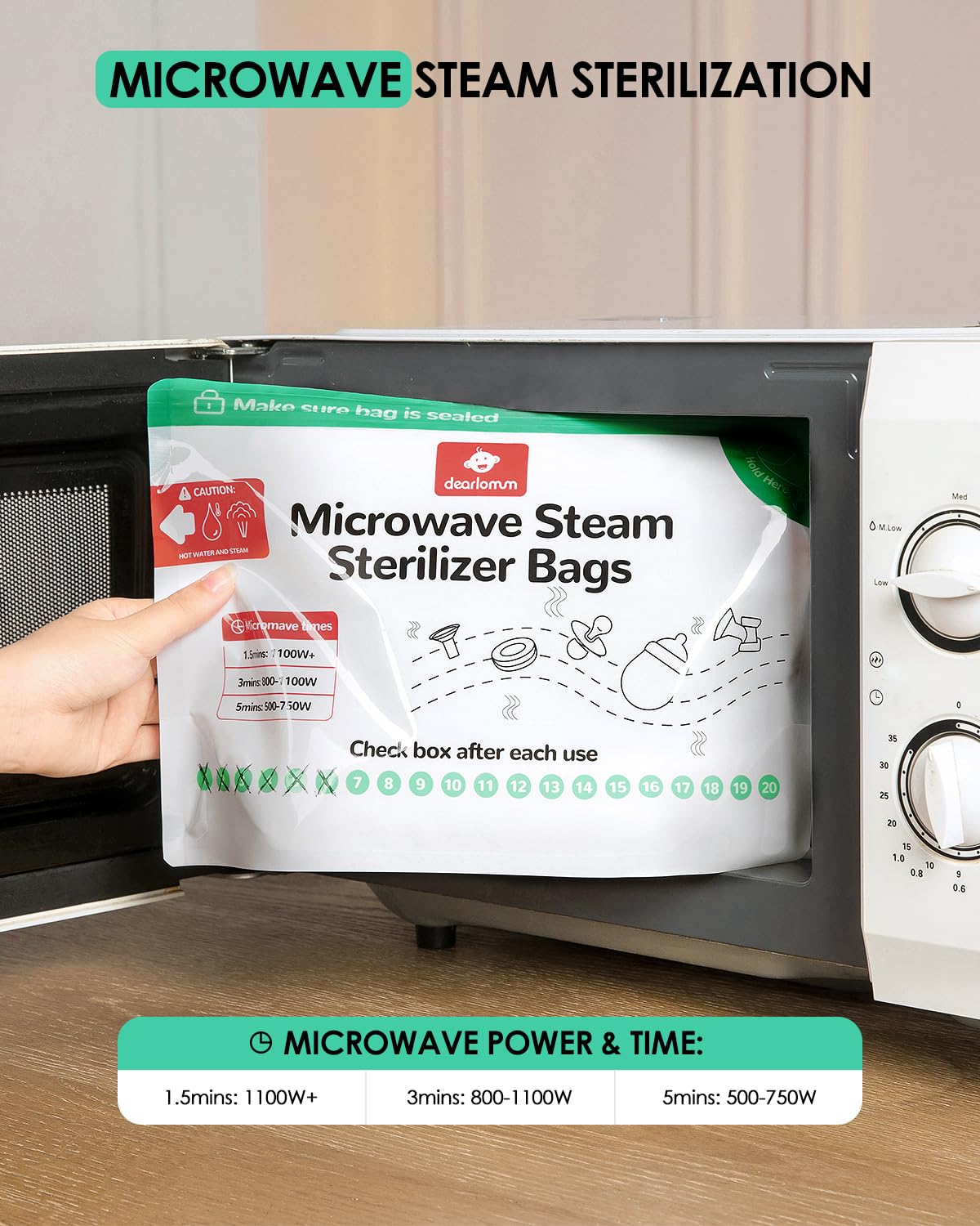 dearlomum Microwave Steam Sterilizer Bag for Baby Bottles 8 Count (20 Uses Per Bag), Reusable Travel Sterilization Pouches, Disinfection Container for Baby Pacifiers and Breast Pump Accessories