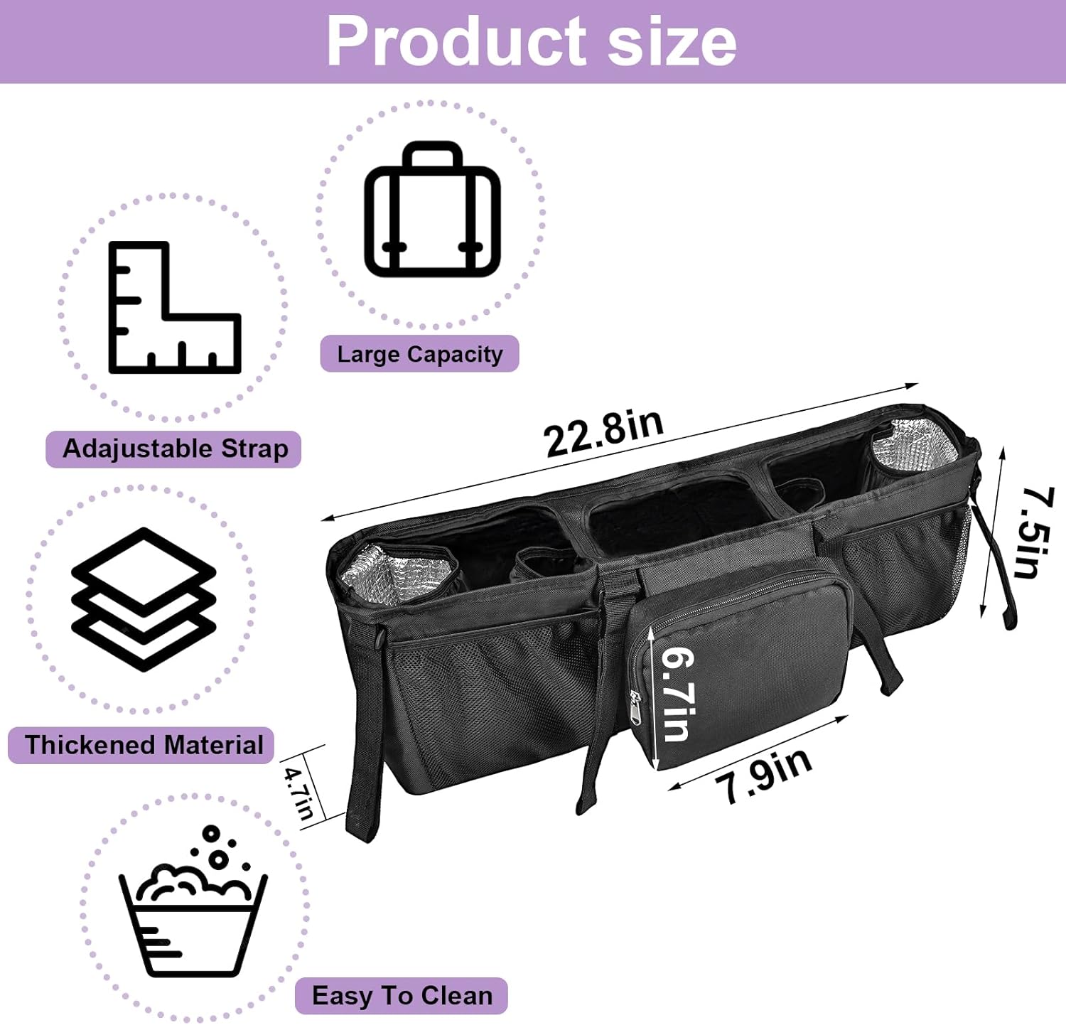 Large Storage:Double stroller organizer is designed in 8 main storage areas, with plenty of storage rooms for snacks, baby bottle, diapers, coffee etc.Large zipper pocket and two mesh pockets for phone, tissues, cards and other small items.This design simplifies cleaning and enhances convenience