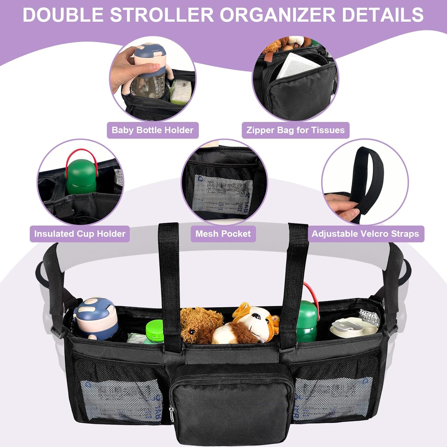 All-in-one Organizer:Made of premium nylon fabric, Double Stroller Organizer features 8 main compartments, Generous space allows to store two baby bottles, diapers, snacks, water bottles, phones, and more.This organizer stroller caddy is a good partner for double Stroller for parents to take their babies out
