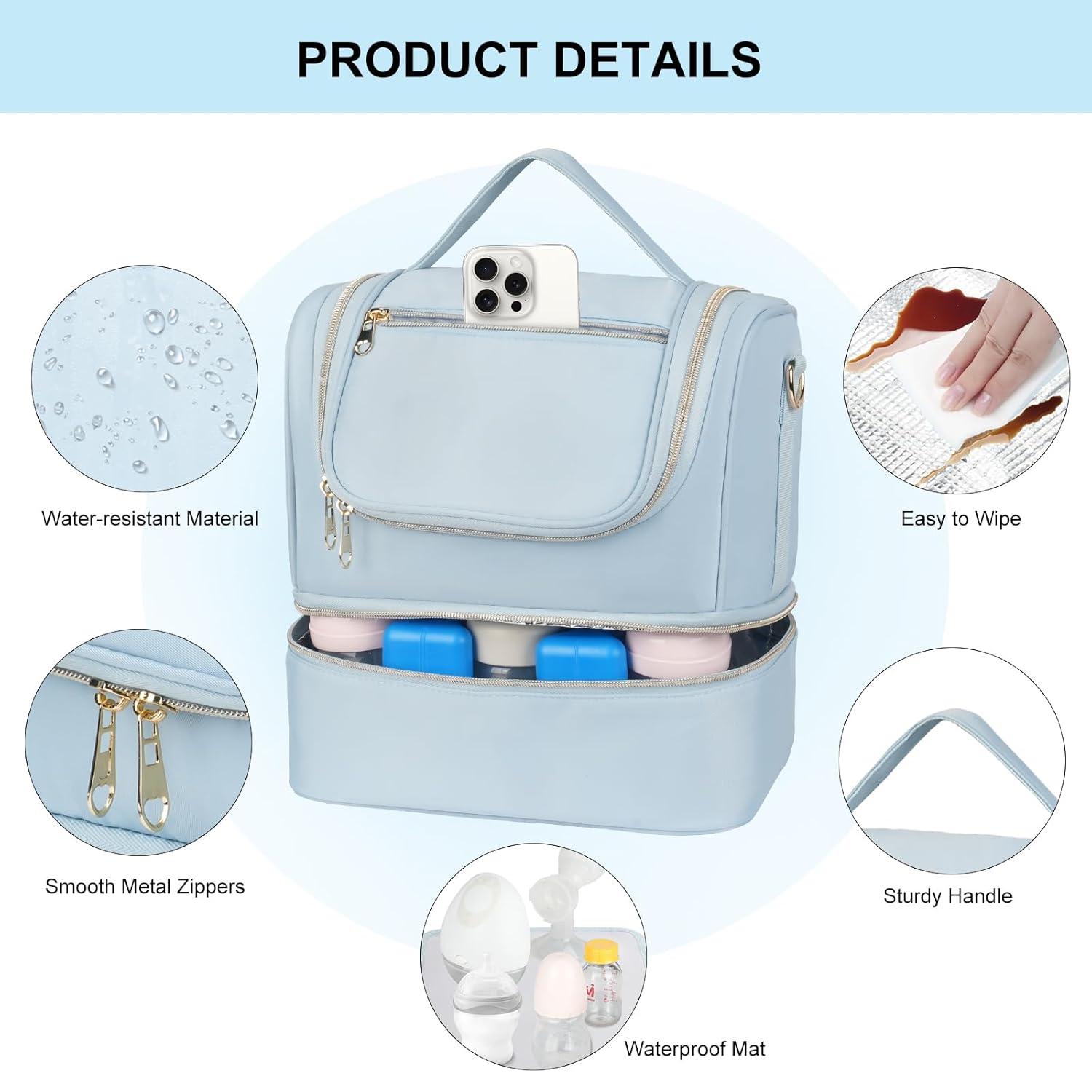 Wearable Breast Pump Bag with Cooler Compartment Fits for Willow/Elvie/Momcozy M5/S12 Pro/Medela, Breast Milk Travel Tote Bag with Ice Pack & Waterproof Mat,Blue