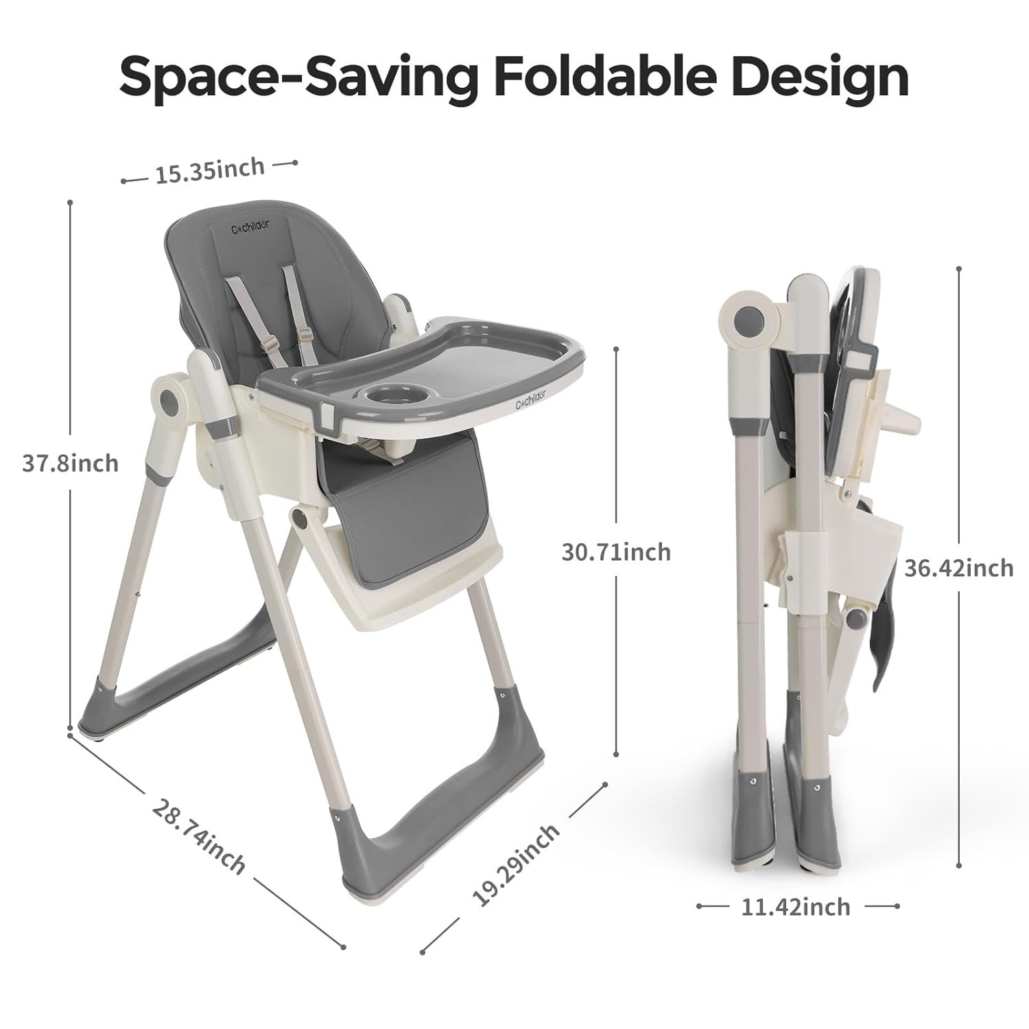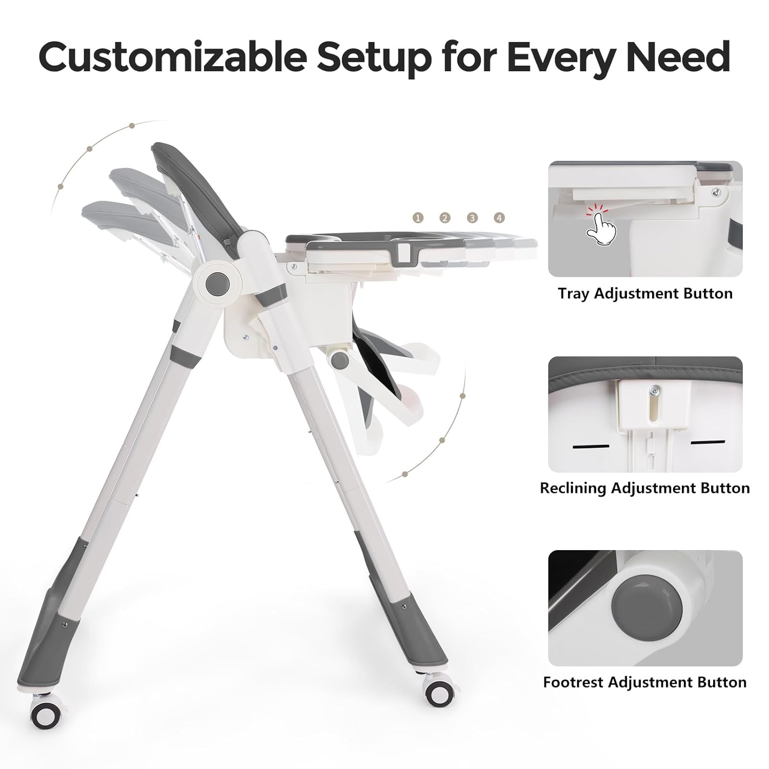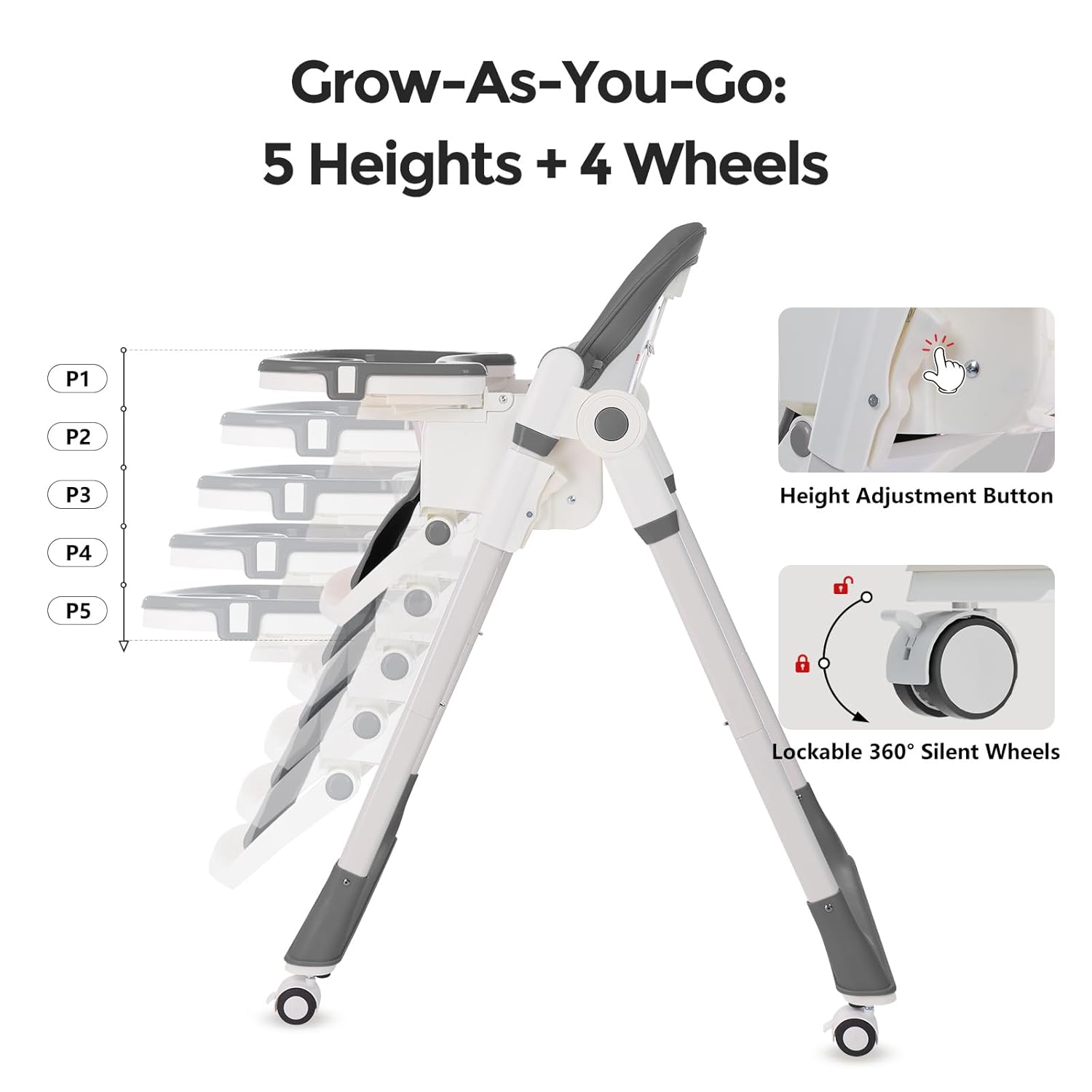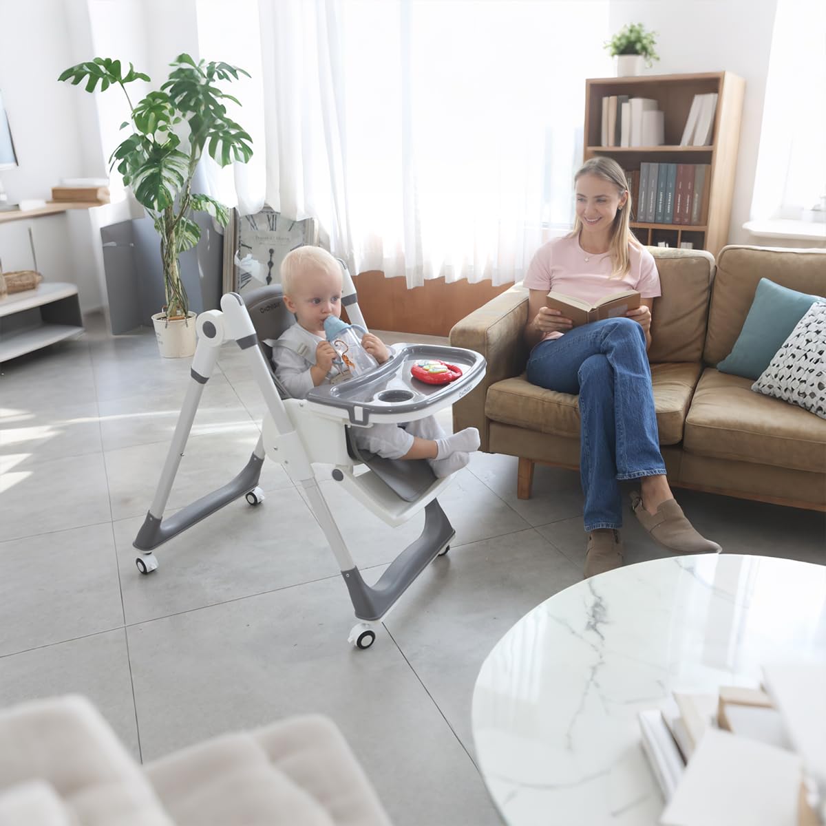 Portable & Compact: Featuring lockable wheels for easy mobility, this high chair folds flat for convenient storage. It’s ideal for city living, apartments, and small spaces, helping you keep your home organized and clutter-free