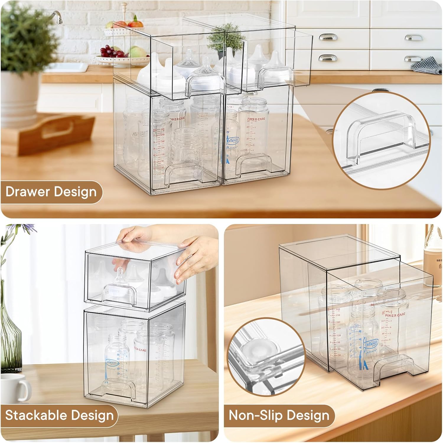 Baby Bottle Organizer, 4 Pack Clear Space-Saving Stackable Drawer with Handle, Baby Bottle Storage Organizer for Countertop and Cabinet