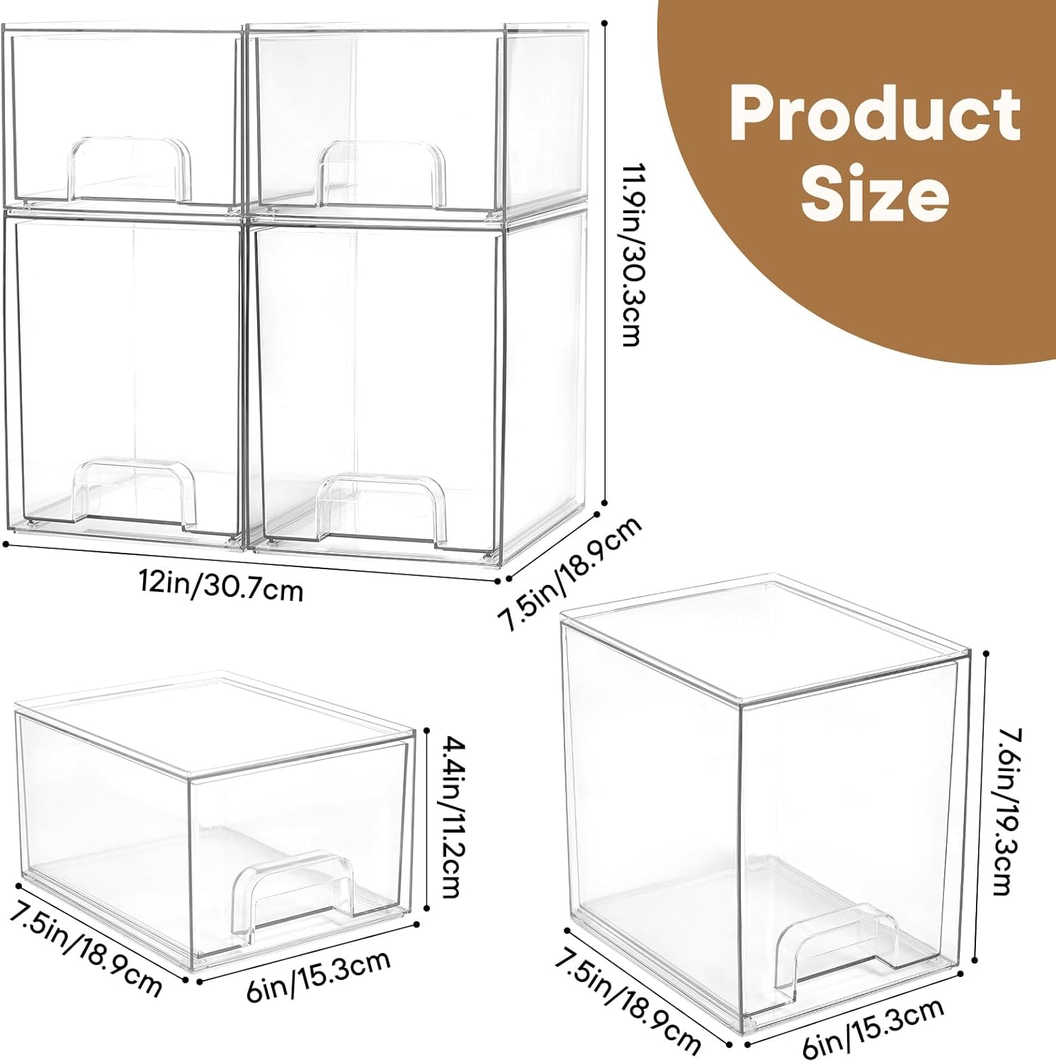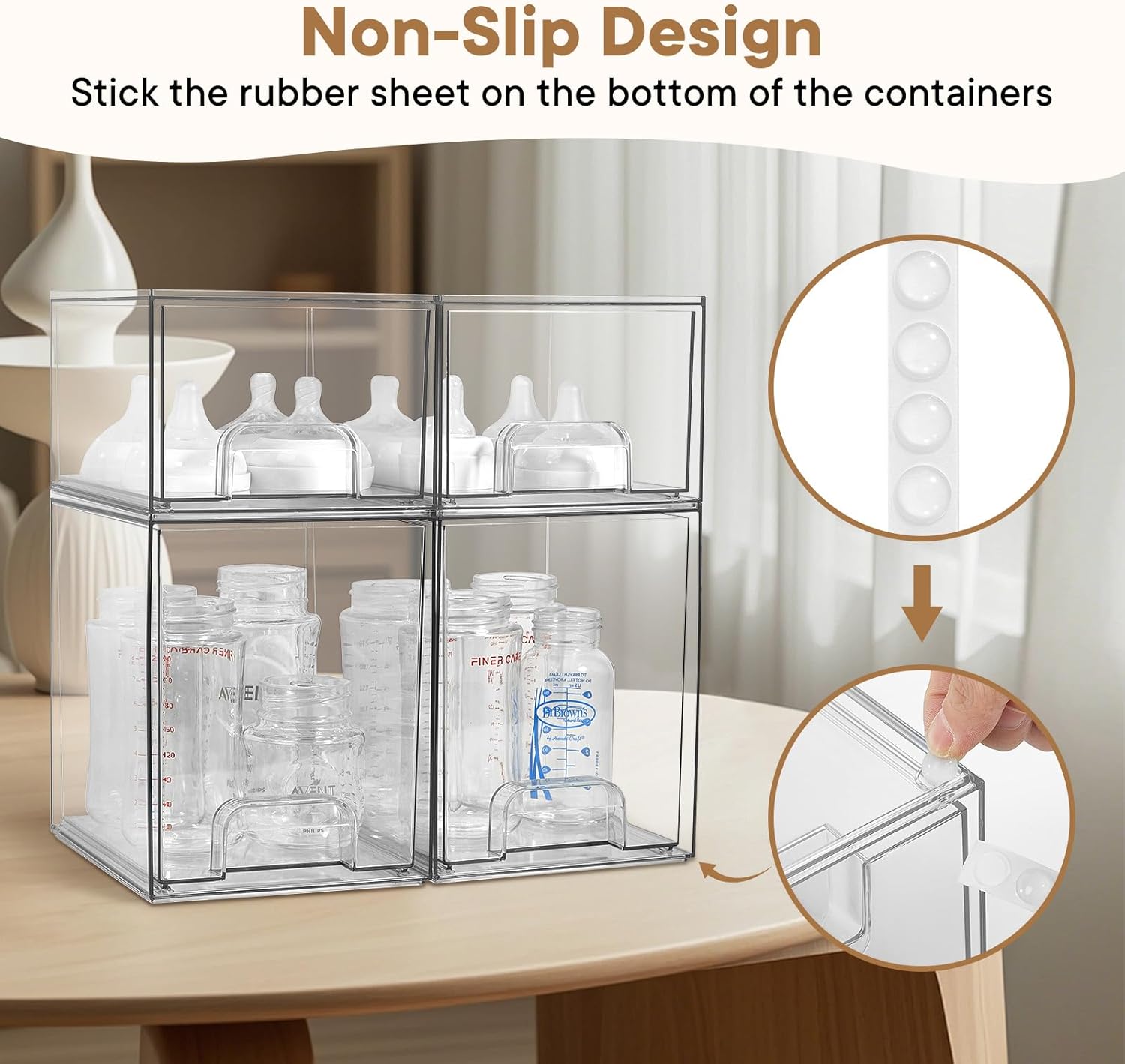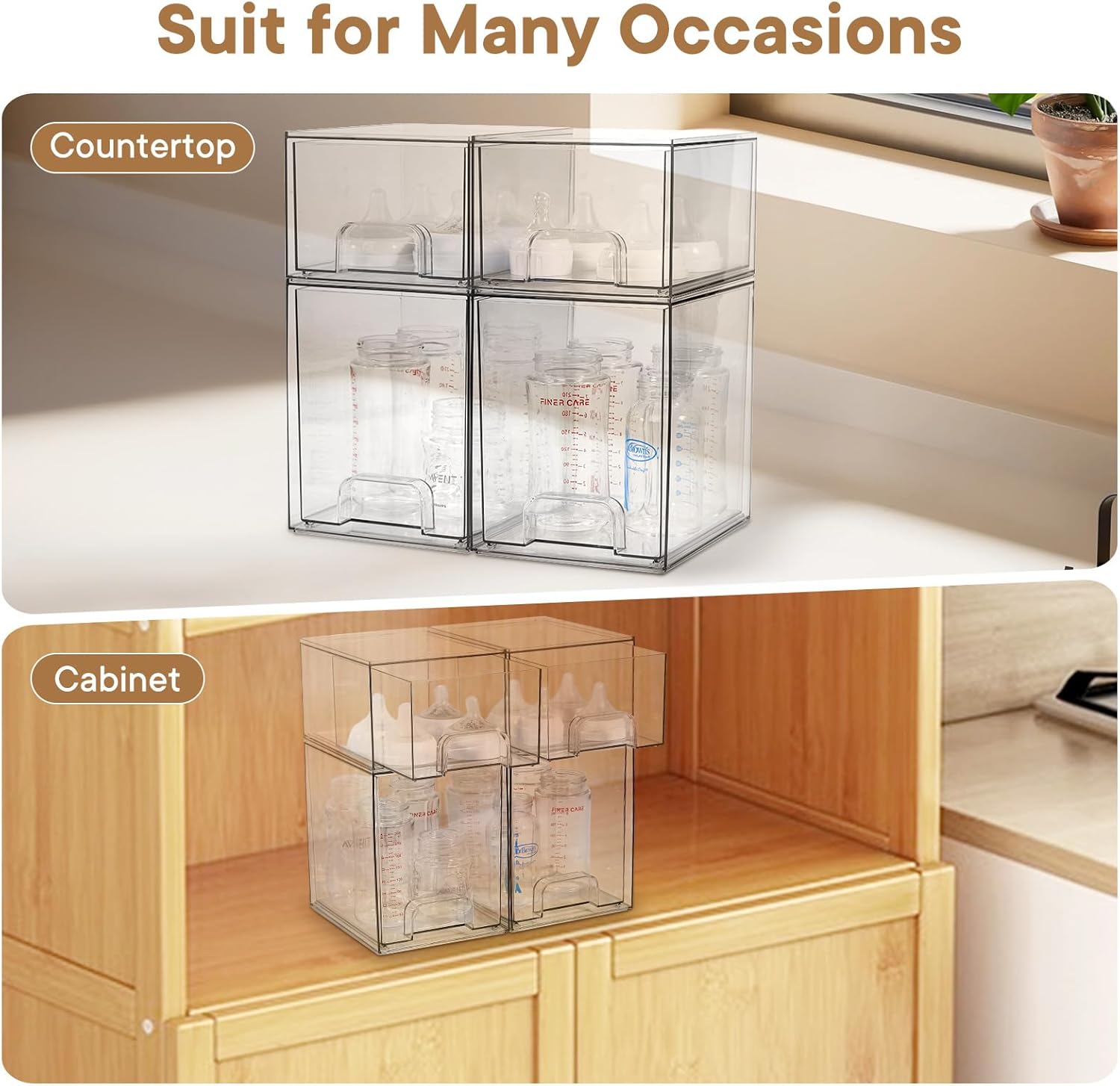 [Stackable Design] Come with 4 pack baby bottle storage drawers, included 4.4”H x 2 and 7.6‘’H x 2 storage containers. The storage containers are stackable, vertical storage will save a lot of space. Store your baby bottles and accessories in acrylic stackable drawers to make your countertop space more neat.