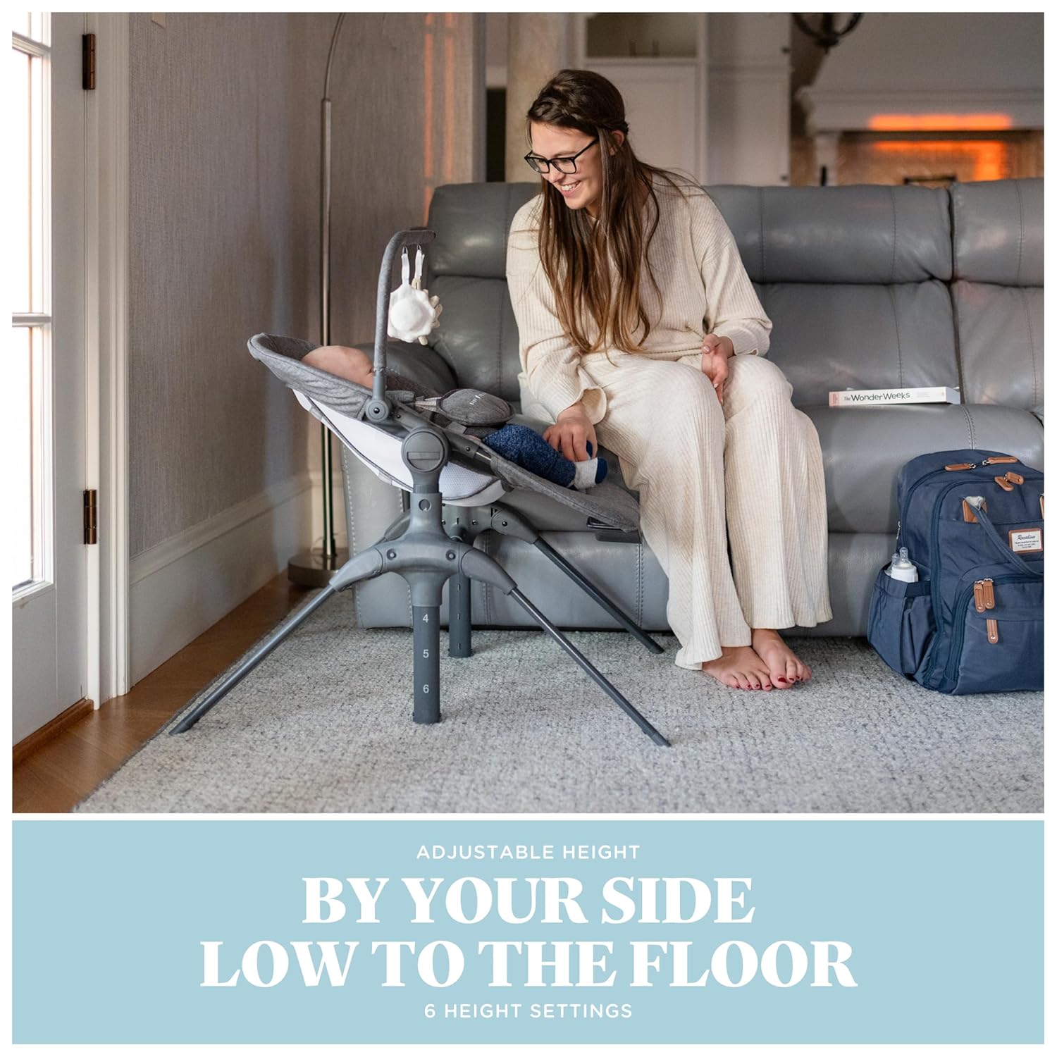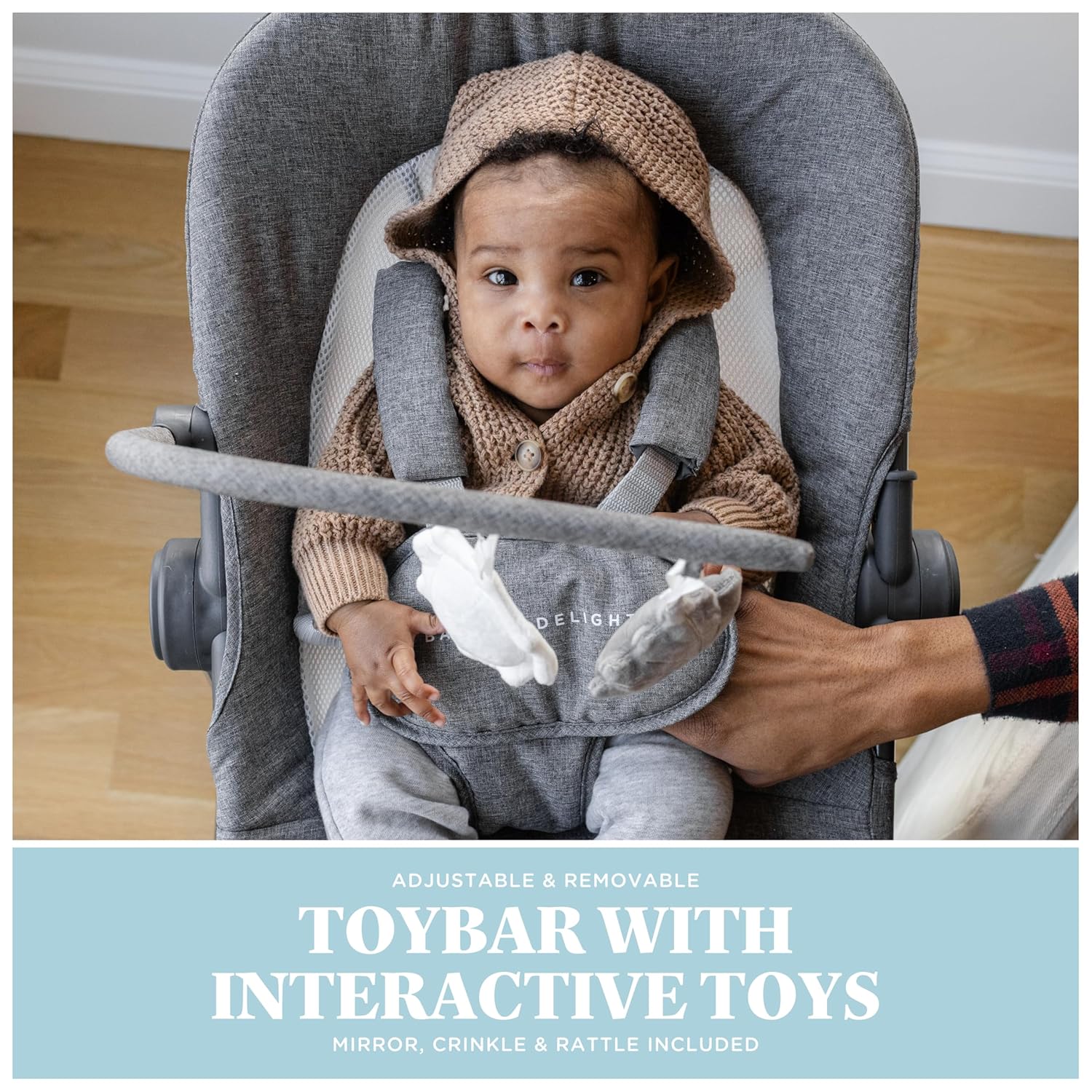 Your little one can comfortably lounge and interact in the Baby Delight® Bloom Soothing Adjustable Lounger. Whether you’re relaxing on the floor or at a table, the 6-position height adjustment allows you to connect with your baby easily. Soothe your baby from any position with our 3-position recline option and sound and vibration unit. The 5-point harness and breathable mesh inset provide your little one with a comfortable space while providing you with some peace of mind. Your baby will be happily entertained while playing with the two included plush toys! As we know style matters, the Bloom was created with a premium, plush, Charcoal Tweed fabric that was designed to match any home’s aesthetic. With that being said, the seat cover be removed quickly and easily for machine washing when your baby makes a mess. The Bloom’s compact folding design and included travel bag is perfect for storage or on-the-go.