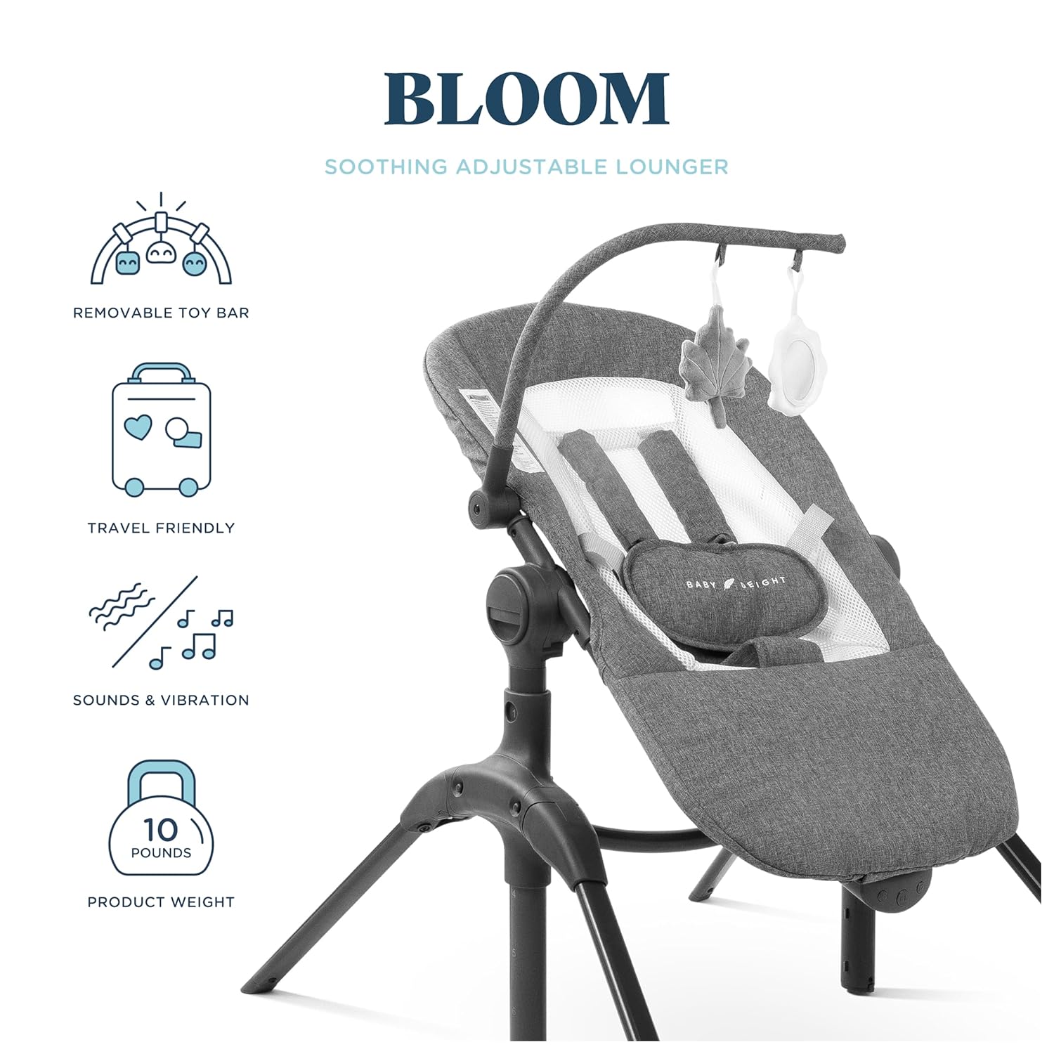 Your little one can comfortably lounge and interact in the Baby Delight® Bloom Soothing Adjustable Lounger. Whether you’re relaxing on the floor or at a table, the 6-position height adjustment allows you to connect with your baby easily. Soothe your baby from any position with our 3-position recline option and sound and vibration unit. The 5-point harness and breathable mesh inset provide your little one with a comfortable space while providing you with some peace of mind. Your baby will be happily entertained while playing with the two included plush toys! As we know style matters, the Bloom was created with a premium, plush, Charcoal Tweed fabric that was designed to match any home’s aesthetic. With that being said, the seat cover be removed quickly and easily for machine washing when your baby makes a mess. The Bloom’s compact folding design and included travel bag is perfect for storage or on-the-go.