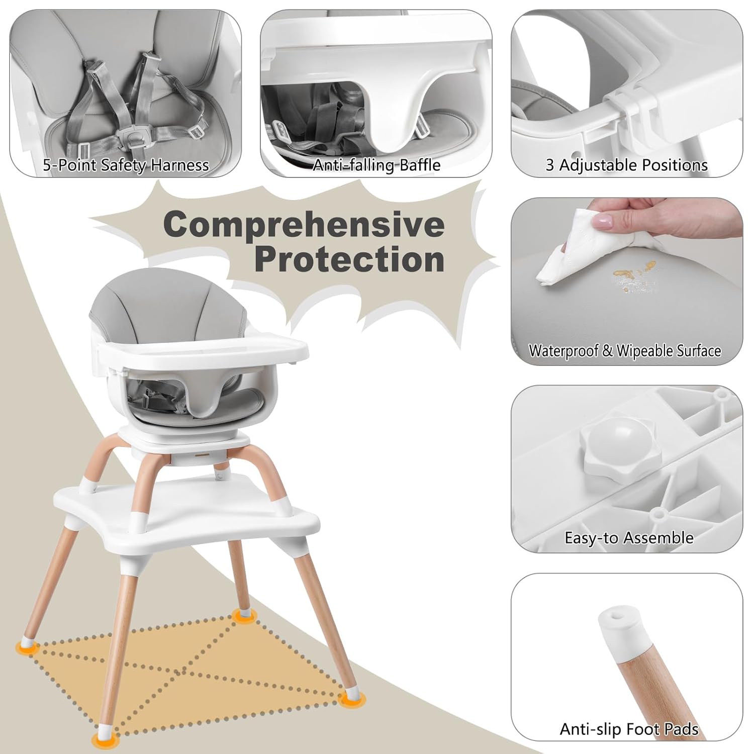 【EASY ASSEMBLE & CLEANING】The high chair for baby assembly is tool-free and quick to finish due to its self-locking design. The tray can be easily removed for cleaning, and the smooth and waterproof PU seat can be wiped down with a wet cloth. There are no unnecessary crevices where food can get stuck, making it easy to maintain. This easy-to-clean high chair provides busy parents with added convenience.