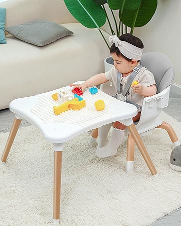 【DOUBLE-SIDED TABLE & CHAIR SET】In order to meet the needs of play and study at the same time, our baby highchair can be transformed into a table and chair set. The tabletop can be converted into a smooth surface for eating and studying, while the other side serves as a building block table for creative play with blocks. Note: Building block table only suitable for large building blocks with a diameter of 9mm.