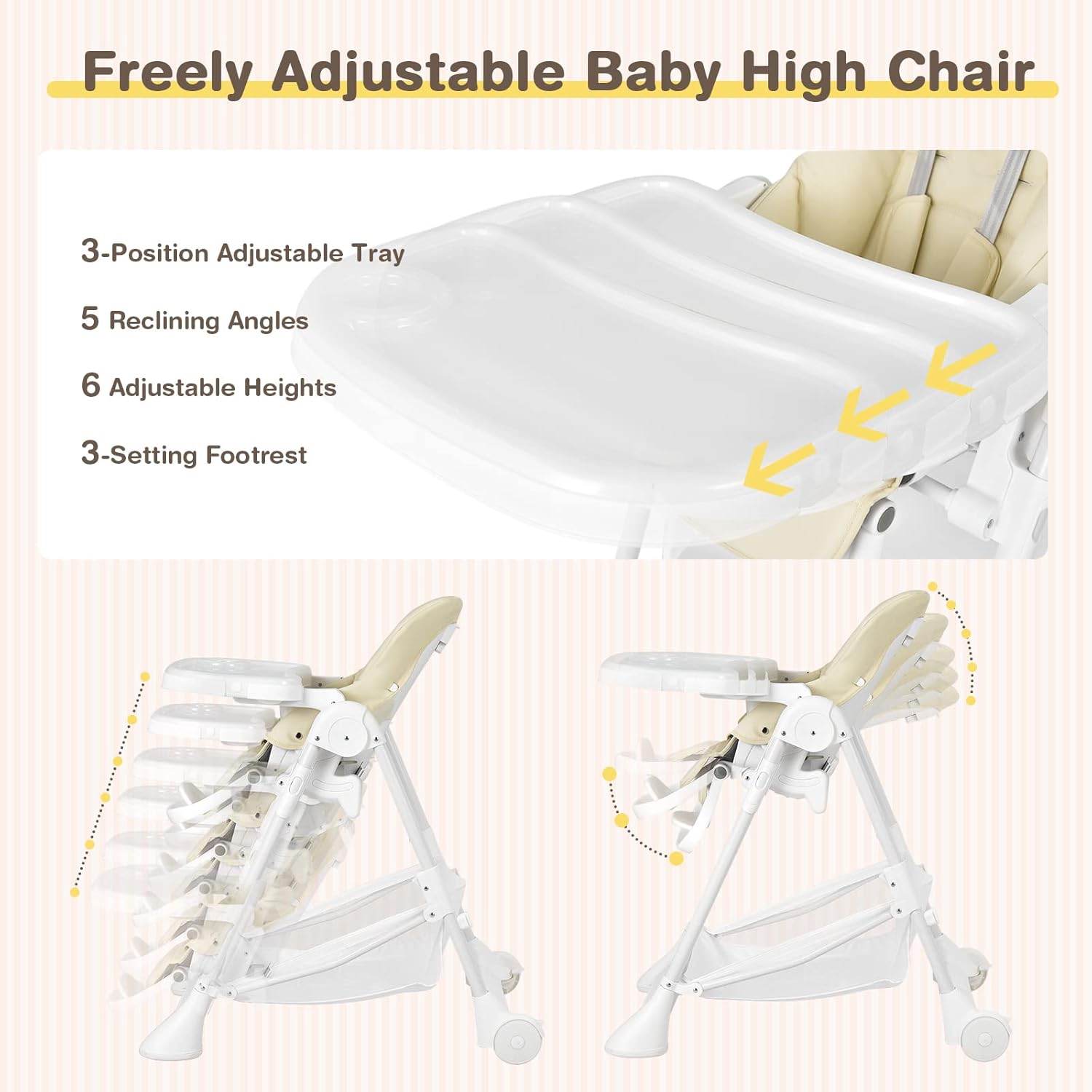 High Chair with Flexible Adjustment: This baby high chair comes with multiple adjustments to meet various needs. The 6-position adjustable height and 3-gear adjustable food tray can match tables at different heights and accompany the growth of the baby. The 5-position backrest is perfect for different activities. Besides, the 3-position footrest with 3 heights is designed to meet the baby’s various postures.