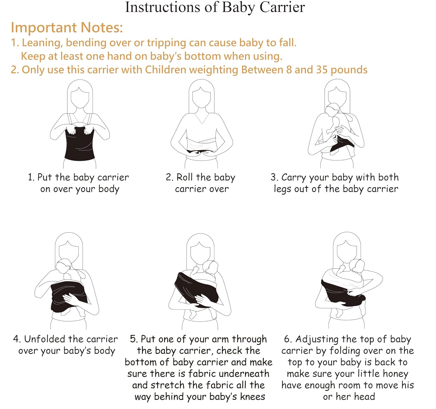 IMPORTANT NOTES: Leaning, bending over or tripping can cause baby to fall. Keep at least one hand on baby’s bottom when using. Only use this carrier with Children weighting Between 8 and 35 pounds.