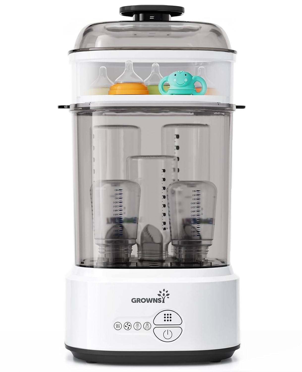 【Peace of Mind】With Drying function followed automatically after 99.99% steam sterilization, Grownsy’s bottle sanitizer effectively prevents mold from growing inside baby bottles. Build-in filter prevent secondary pollution by exposure to new contamination in the air. Double protection, Twice as much love.