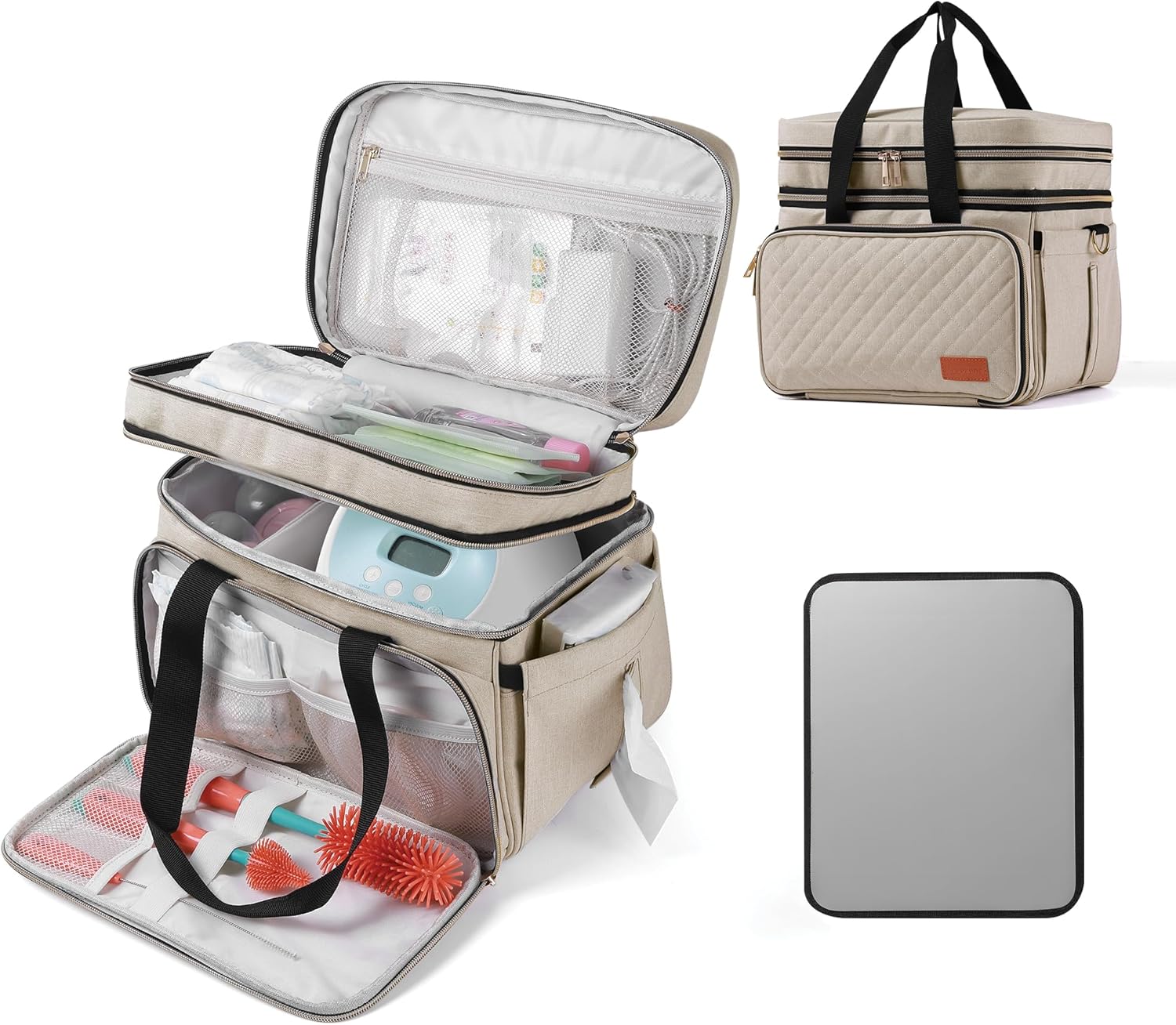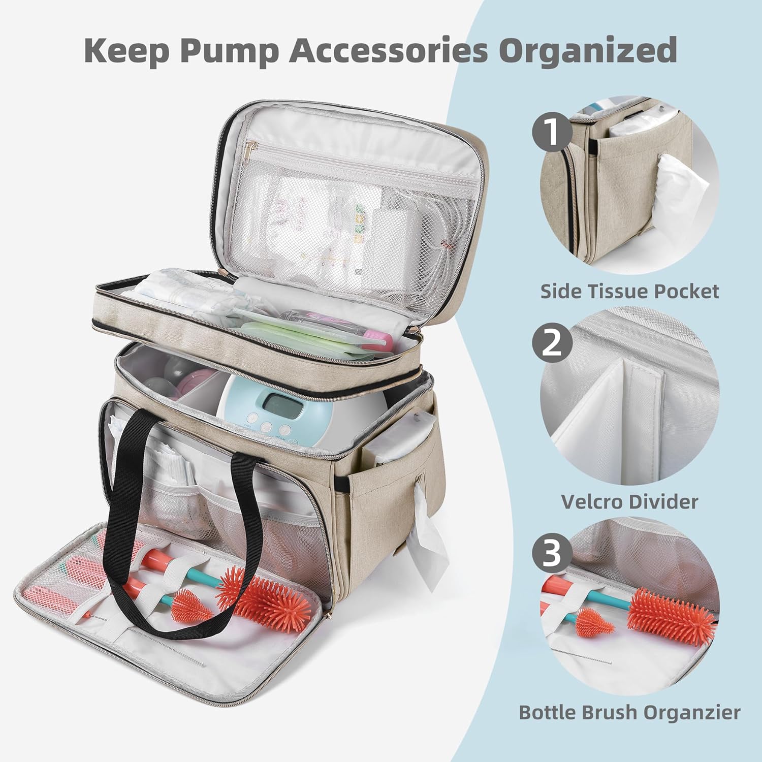 【Versatile & Spacious】Ideal as pumping bags for moms work or travel, this pump bag’s removable divider allows customizable space. Carry your pump, baby bottles and essentials like diapers—all in one organized, compact breast pump bag.Come with a waterproof pad to keep pump parts clean